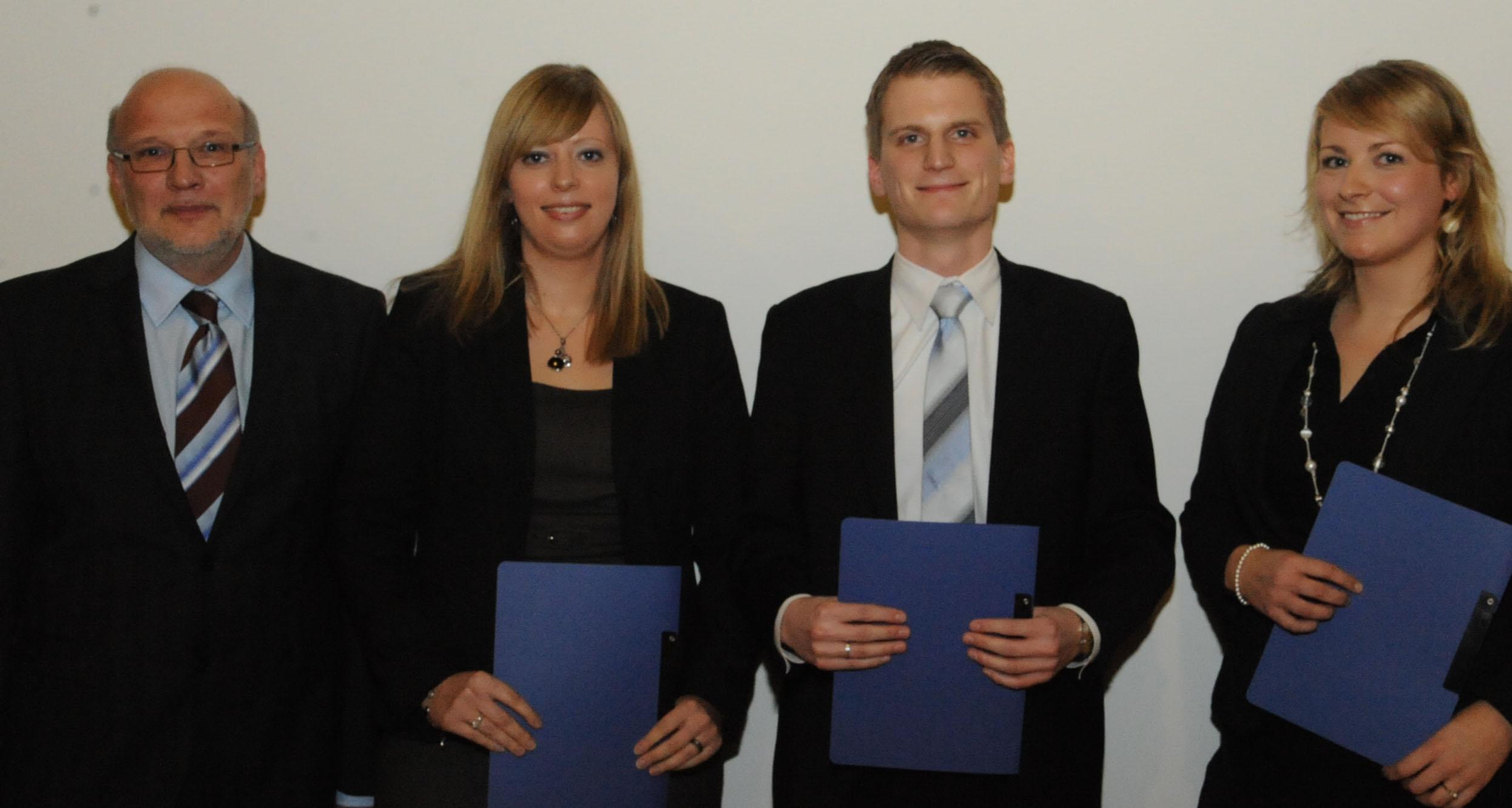 Auf dem Foto (v.l.): Prof. Dr. Thomas Breisig (stellv. Vorsitzender des Fördervereins) überreicht Wiebke Welp, Daniel Niemeyer und Mareike Ricarda Michel den Preis des Fördervereins Wirtschafts- und Rechtswissenschaften e.V.