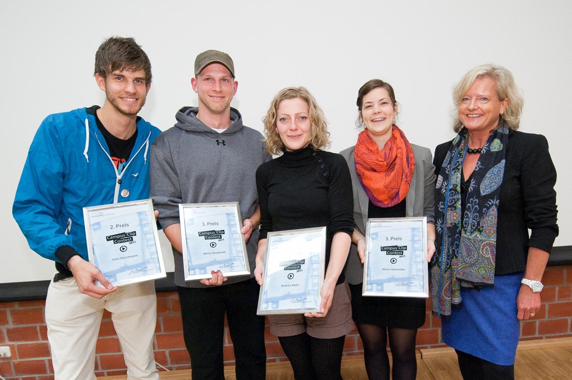 Auf dem Foto: Die Gewinner des Campus Clip Contest 2011 (v.l.): Felix Fleischmann, Moritz Klinghardt, Beatrice Bader, Maren Holzmüller, Prof. Dr. Gunilla Budde