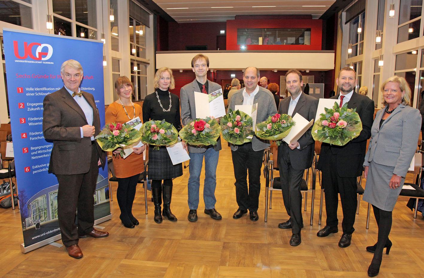 Auf dem Foto (v.l.): UGO-Vorsitzender Michael Wefers, PreisträgerInnen Katrin Ratz, Prof. Dr. Corinna Hößle, Prof. Dr. Dirk Albach, Dr. Klaus Bernhard von Hagen, Andreas Günther, Gerhard Holtorf sowie Vizepräsidentin Prof. Dr. Gunilla Budde