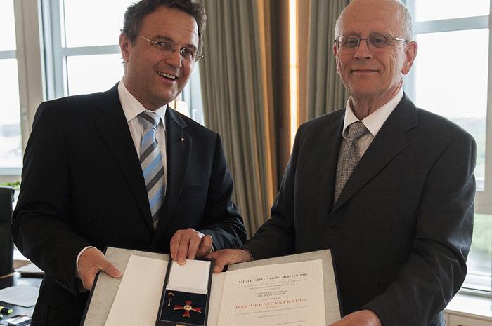 Bildunterschrift: Bundesverdienstkreuz Erster Klasse: Bundesinnenminister Dr. Hans-Peter Friedrich übergibt Prof. Dr. Klaus Lenk den Orden, Foto: BMI
