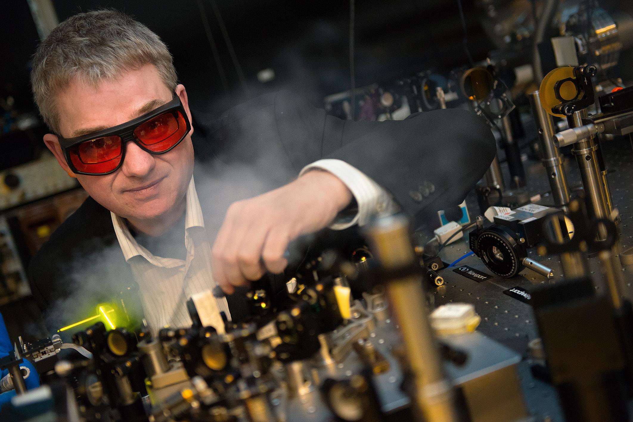 Prof. Lienau justiert einen Femtosekundenlaser, der ultrakurze Elektronenimpulse erzeugt.