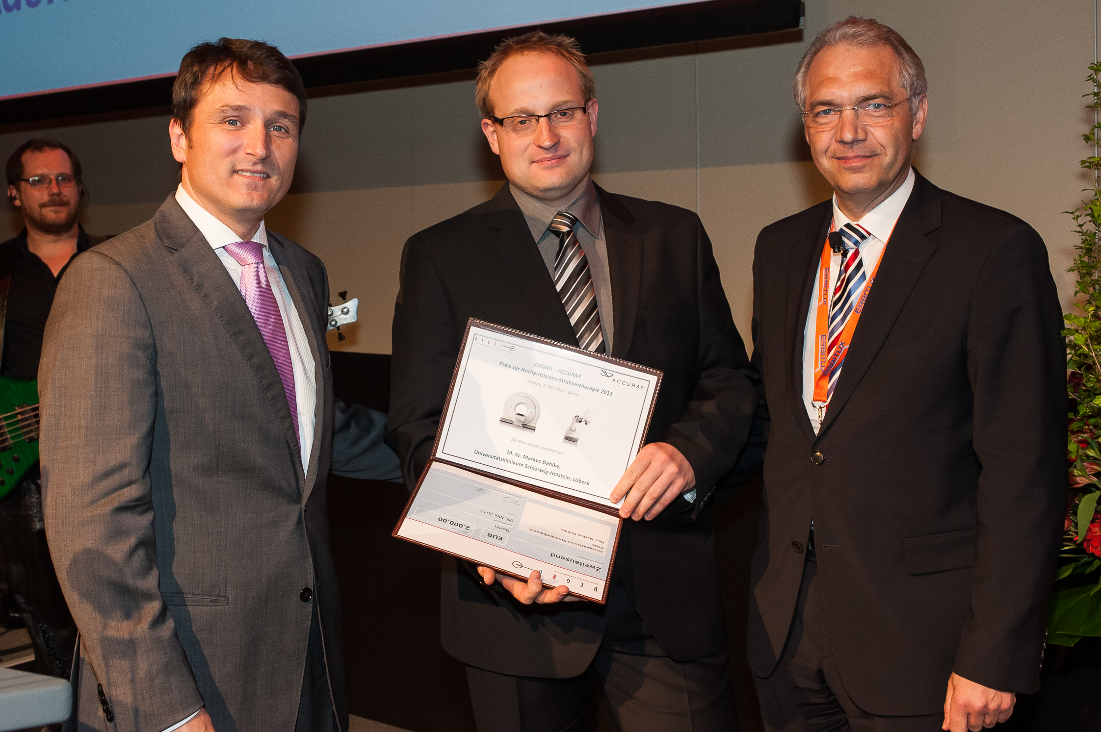 Auf dem Foto (v.l.): Matthias Franz, Vertriebsleiter der Firma Accuray, Preisträger Markus Dahlke und DEGRO-Präsident Prof. Dr. Jürgen Dunst