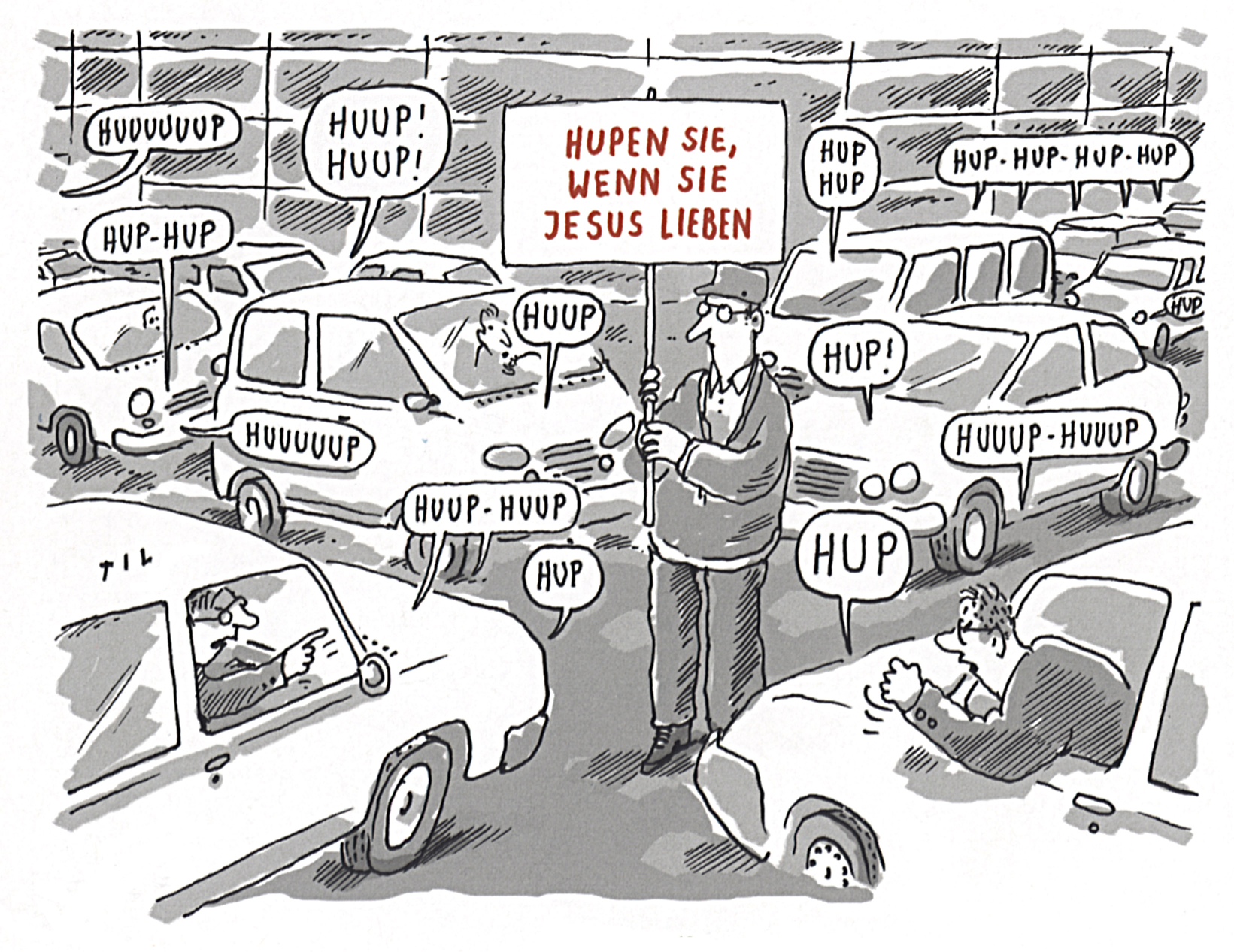 Oldenburg. Der Stern-Cartoonist Til Mette, eröffnet am Montag, 21. Oktober, 19.00 Uhr, im Foyer der Universitätsbibliothek Oldenburg (Campus Haarentor, Uhlhornsweg) persönlich die Ausstellung „Til Mette – Hupen Sie, wenn Sie Jesus lieben“. Er diskutiert mit dem Religionswissenschaftler Tobias Frick über sein Buch „Gott, oh Gott…“. Darin setzt er sich in schwarz-weiß gezeichneten Cartoons auf ironische Weise mit religiösen Themen auseinander. Die Cartoons sind in der Ausstellung zu sehen.