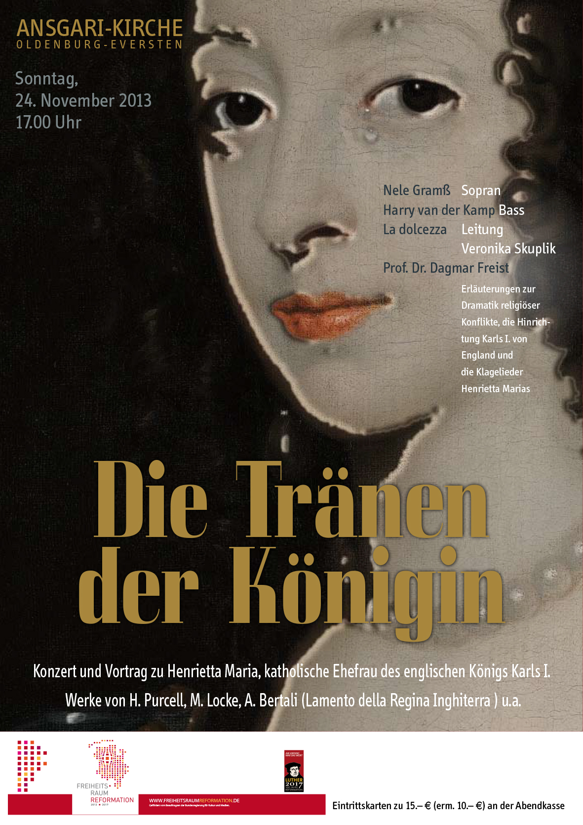 Oldenburg. „Die Tränen der Königin“ – unter diesem Titel findet am Sonntag, 24. November, 17.00 Uhr, in der Oldenburger Ansgari-Kirche, eine Veranstaltung mit Konzert und Erläuterungen von Prof. Dr. Dagmar Freist, Historikerin an der Universität Oldenburg, statt. Auf dem Programm des von Veronika Skuplik geleiteten Ensemble „La Dolcezza“ stehen Werke von Henry Purcell (1659 –1695), Matthew Locke (1621 – 1677) und Antonio Bertali (1605 – 1669). Solisten sind Nele Gramß (Sopran) und Harry von der Kamp (Bass). Die Veranstaltung ist Teil des nordwestdeutschen Kooperationsprojekts „Freiheitsraum Reformation“, das die Universität koordiniert.