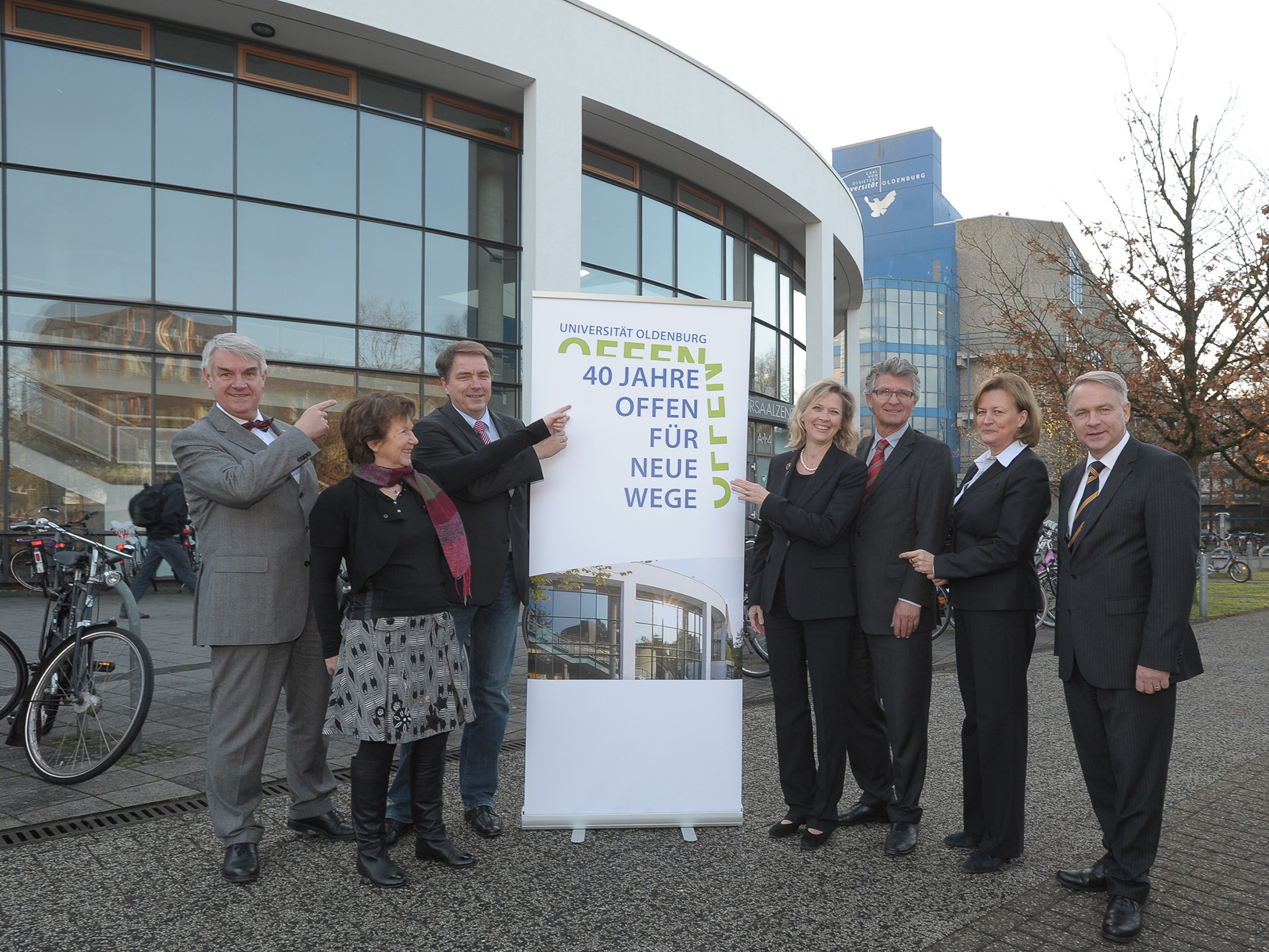 Auf dem Foto: Bild 1: 40 Jahre offen für neue Wege – die Universität Oldenburg feiert Geburtstag (v.l.): UGO-Vorsitzender Michael Wefers, JubiläumsbotschafterInnen Dr. Thea Dückert und Jürgen Krogmann, Universitätspräsidentin Prof. Dr. Babette Simon, Oberbürgermeister Prof. Dr. Gerd Schwandner, Jubiläumsbotschafterin Maria Bruns sowie Jörg Waskönig, Vorsitzender des Hochschulrats.
