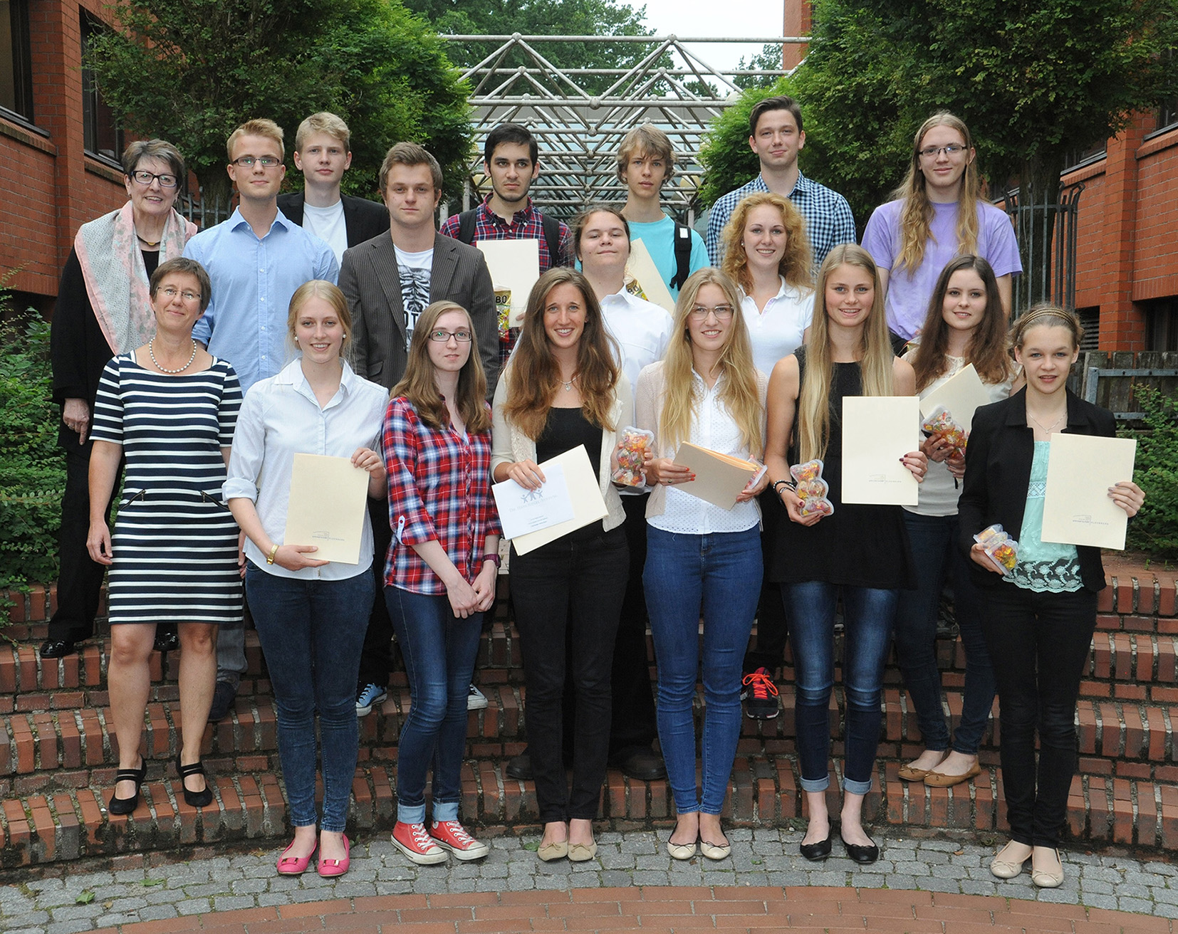 Bild: Insgesamt acht Schülerinnen und neun Schüler aus Niedersachsen wurden für ihre herausragenden Facharbeiten von der Studiendekanin Dr. Andrea Ruf (vorne links) und Prof. Ingeborg Henzler aus dem Vorstand der Dr. Hans Riegel-Stiftung (hinten links) ausgezeichnet. Foto: Wilfried Golletz