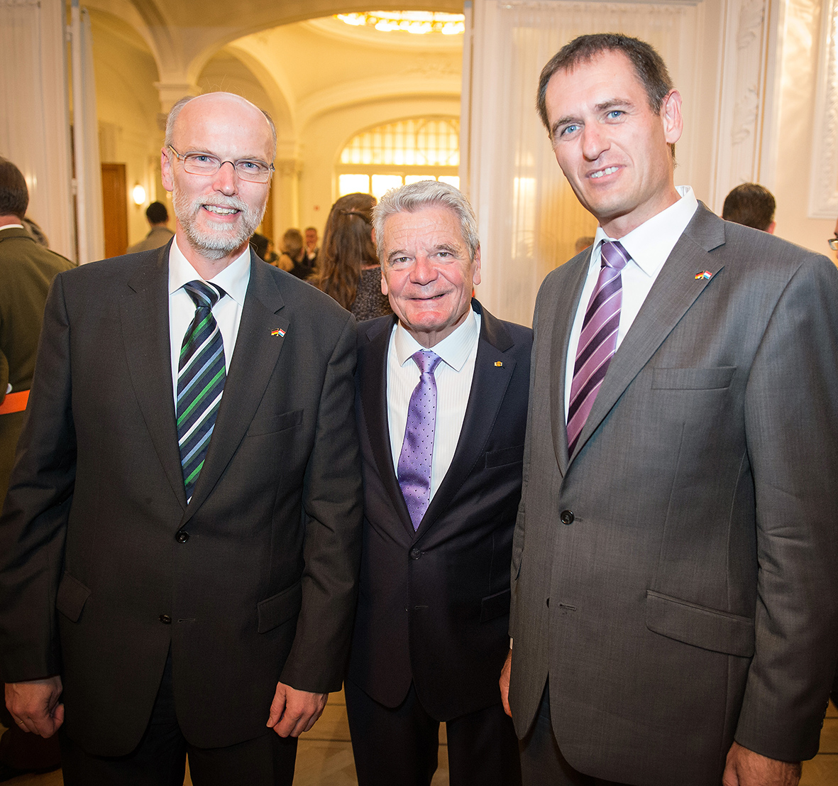 Auf dem Bild: Bundespräsident Joachim Gauck umrahmt von den Zukunftspreisträgern Prof. Dr. Dr. Birger Kollmeier (links) und Dr. Torsten Niederdränk. Foto: Guido Bergmann, Bundespresseamt