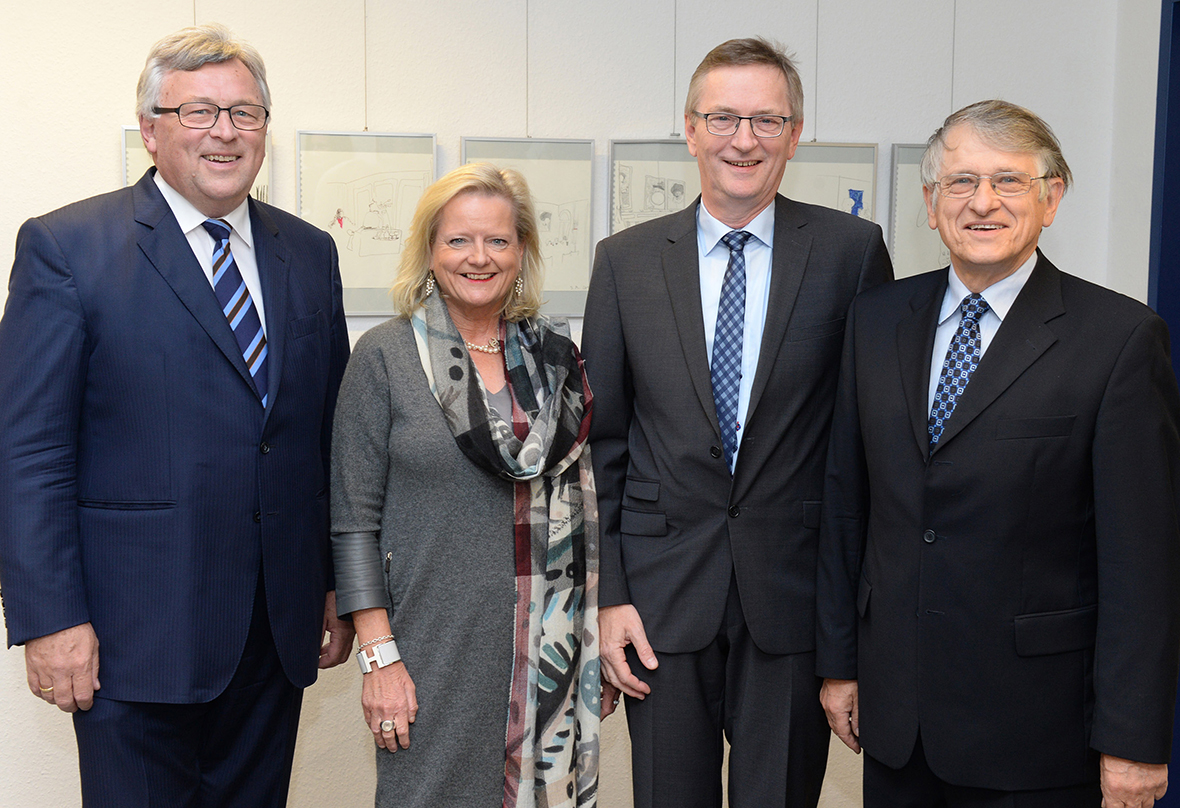 Auf dem Foto (v.l.): Werner Brinker, Vorstandsvorsitzender EWE Stiftung, Vizepräsidentin Prof. Dr. Gunilla Budde, Preisträger Werner Decker, Physik-Nobelpreisträger Prof. Dr. Klaus von Klitzing,.