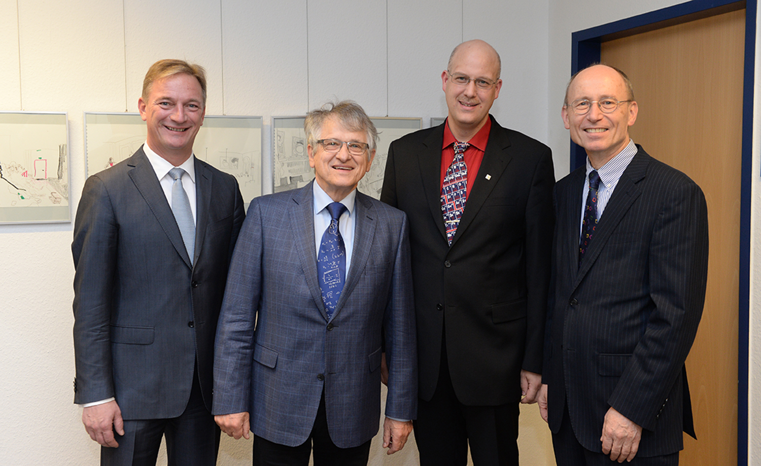 Matthias Brückmann, Vorstandsvorsitzender der EWE-Stiftung, Prof. Dr. Klaus von Klitzing, Nobelpreisträger und Namensgeber des Preises, Christian Lorey, Preisträger, Prof. Dr. Dr. Hans Michael Piper, Präsident der Universität.