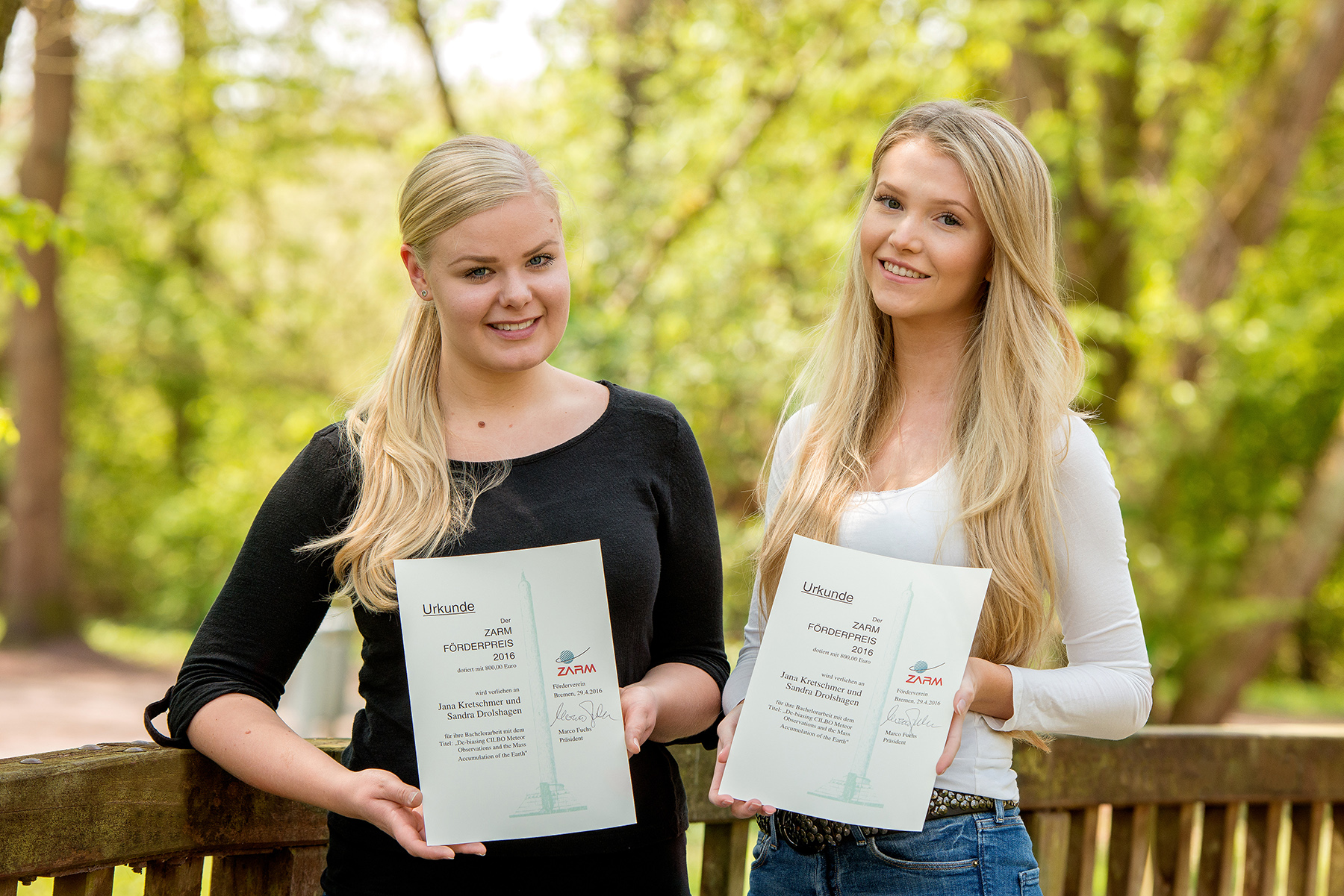 Oldenburg. Die Physikstudentinnen Jana Kretschmer und Sandra Drolshagen sind am Freitag mit einem „Förderpreis 2016“ des Zentrums für angewandte Raumfahrttechnologie und Mikrogravitation (ZARM) der Universität Bremen ausgezeichnet worden. Die beiden Absolventinnen des Studiengangs „Engineering Physics“ erlangten den dritten Platz, der mit 800 Euro Preisgeld dotiert ist. Ausgezeichnet wurde ihre Bachelorarbeit „De-biasing CILBO Meteor Observations and the Mass Accumulation oft the Earth“, die der Oldenburger Hochschullehrer Prof. Dr. Björn Poppe und Dr. Detlef Koschny von der Europäischen Weltraumagentur (ESA) betreut haben.