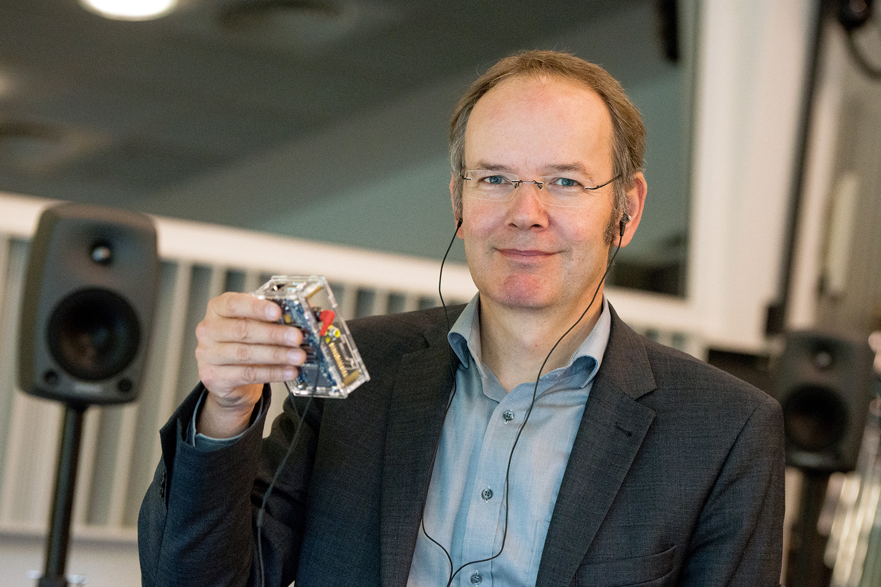 Projektleiter Prof. Dr. Volker Hohmann mit einem Mini-Computer, auf dem die künftige Open-Source-Plattform ebenso laufen könnte wie auf einem Laptop oder Desktop-Computer. Foto: Universität Oldenburg |