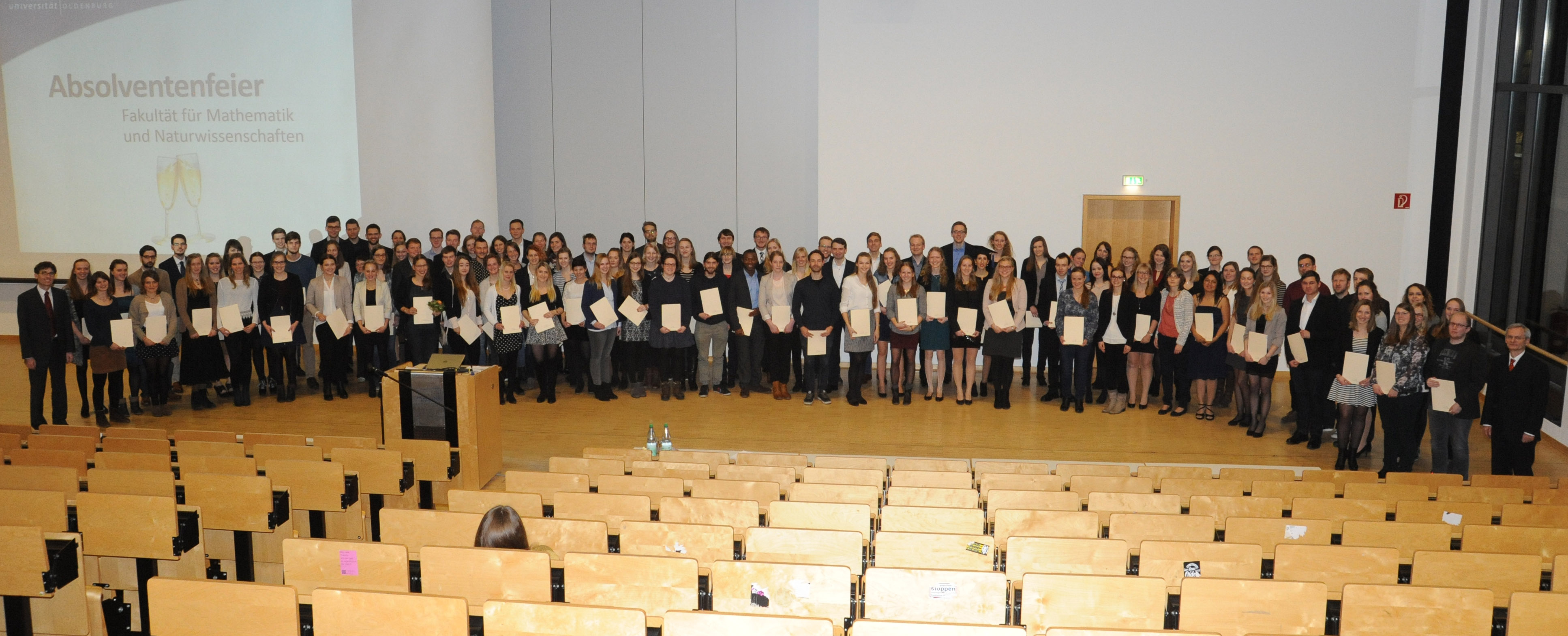 Oldenburg. 109 AbsolventInnen der Fakultät V Mathematik und Naturwissenschaften sind am Freitag, 20. Januar, in einer Feierstunde an der Universität Oldenburg verabschiedet worden. Der Prodekan Prof. Dr. Daniel Grieser überreichte zusammen mit dem Studiendekan Prof. Dr. Andreas Engel den AbsolventInnen der Bachelor- und Master-Studiengänge sowie den PromovendInnen ihre Urkunden. Als besonderen Programmpunkt gab es einen unterhaltsamen Vortrag von Science Slammerin Dr. Bianca Brüggen, Gewinnerin des Oldenburger Science Slams 2016. Insgesamt haben in den vergangenen sechs Monaten mehr als 310 Studierende an der Fakultät V ihren Abschluss gemacht. Zudem wurden 24 Dissertationen angefertigt.