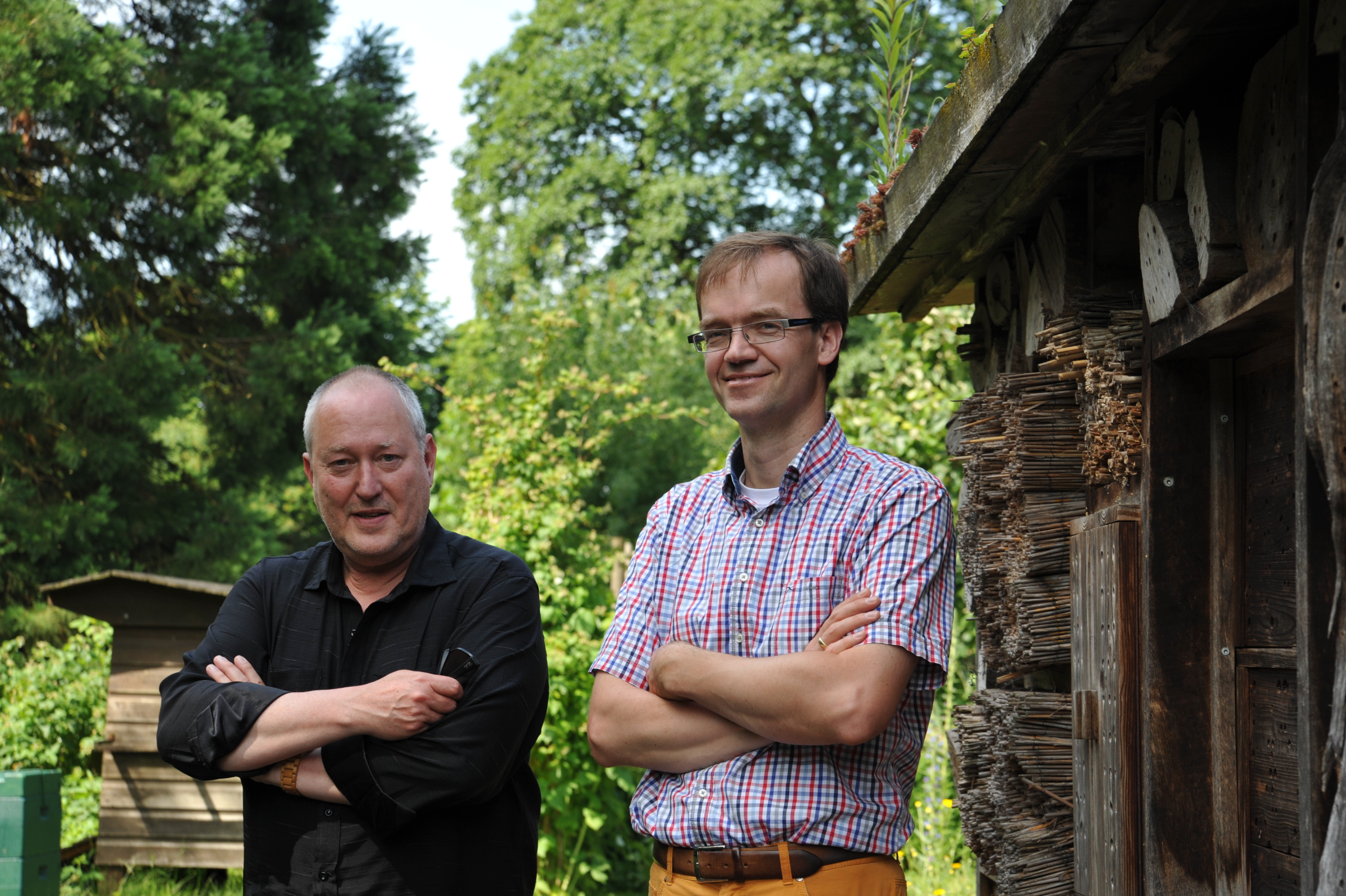 Zwischen Bienenstöcken und Insektenhotel: Prof. Dr. Dirk Albach (r.), Direktor des Botanischen Gartens, und Jan-Willen van Kruyssen, Projekt-Koordinator und geschäftsführender Produzent der Kulturhauptstadt Leeuwarden 2018. |