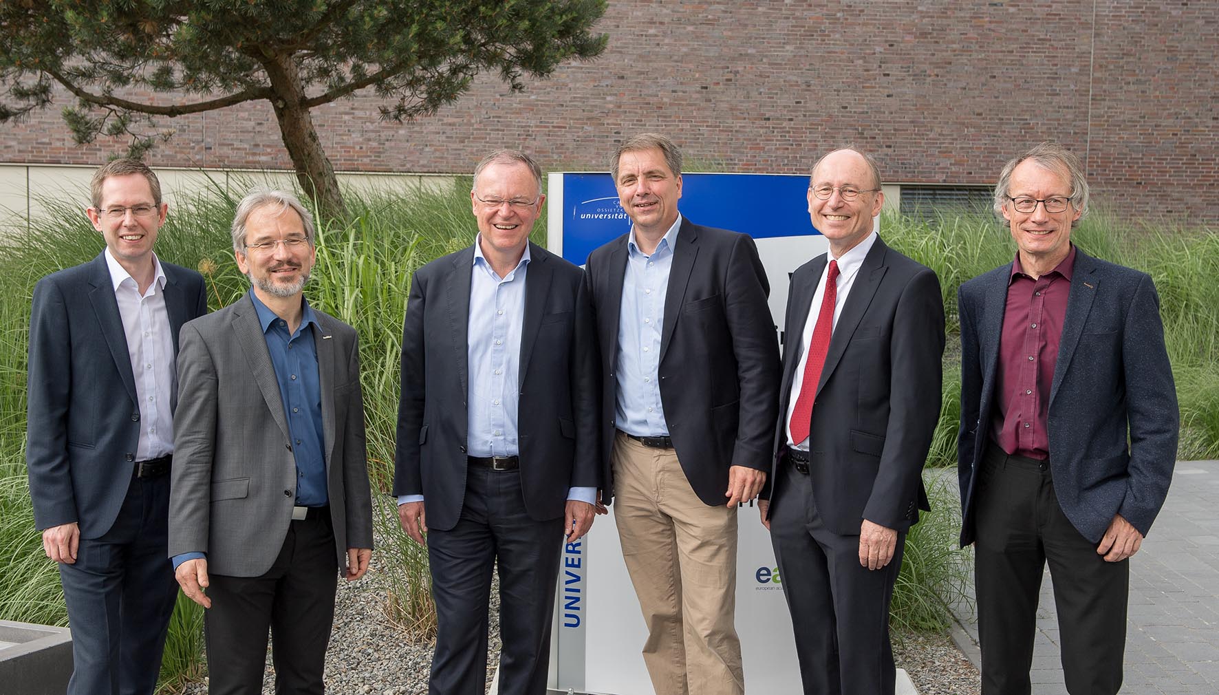 Ministerpräsident Stephan Weil (3. v. re.) zu Gast bei ForWind. Daneben (v. l. n. re.) ForWind-Geschäftsführer Dr. Stephan Barth, Windenergieexperte Prof. Dr. Martin Kühn, Oldenburgs Oberbürgermeister Jürgen Krogmann, Universitätspräsident Prof. Dr. Dr. Hans Michael Piper und der Turbulenzforscher Prof. Dr. Joachim Peinke. |
