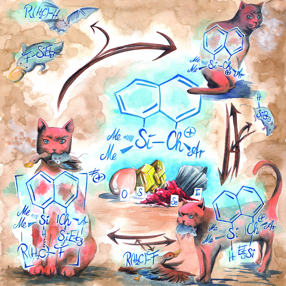 Den sogenannten Katalysezyklus hat Dr. Natalie Kordts für das Titelblatt des Fachmagazins künstlerisch dargestellt: Die Katze (englisch: cat) symbolisiert den Katalysator (englisch: catalist), dessen wichtigster Bestandteil ein Kation – ein positiv geladenes Teilchen – ist (englisch: cation). Die Beutetiere auf dem Bild stehen für die umgesetzten Moleküle. Foto: Natalie Kordts |
