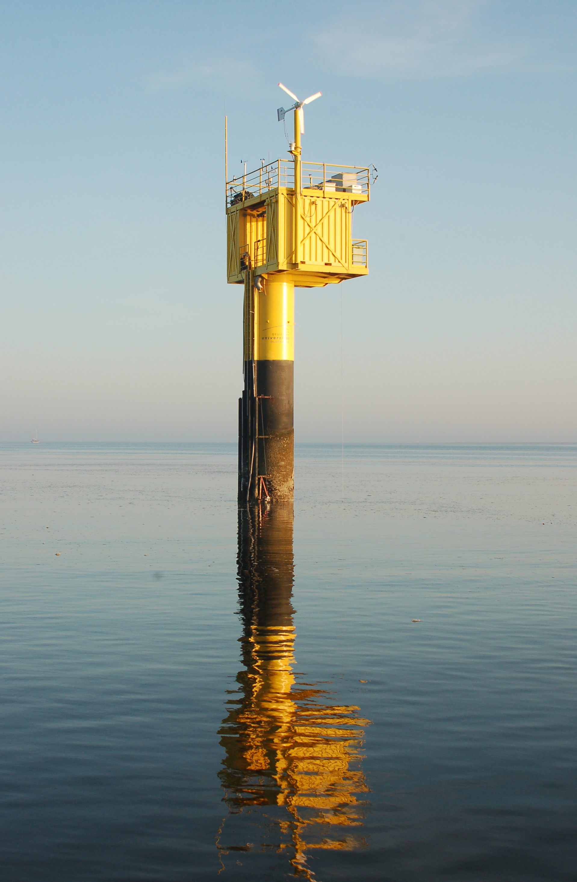 Neben einem Windgenerator versorgen auch Solarzellen auf der oberen Plattform alle Geräte mit dem nötigen Strom. Außerdem gibt es eine Wetterstation, die Daten über Windgeschwindigkeit und -richtung, Lufttemperatur, relative Feuchte, Luftdruck und Sonneneinstrahlung liefert. Ein weiterer Sensor erkennt Oberflächenströmungen und -strukturen. Foto: Thomas Badewien, Universität Oldenburg. |