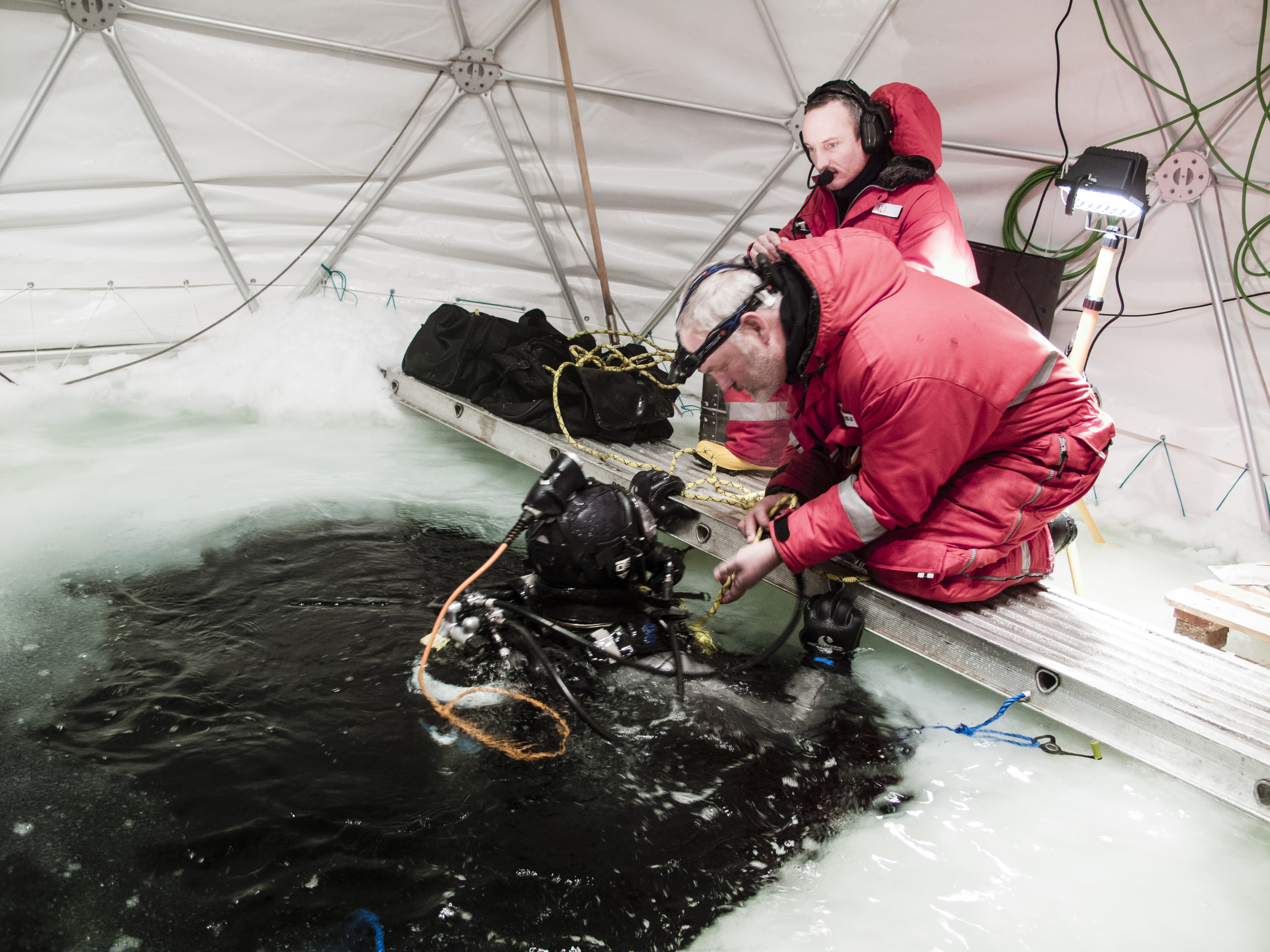 Letzte Vorbereitungen vor dem Tauchgang unter das Eis, bei dem die Wissenschaftler den Krill beobachten und Proben entnehmen. |