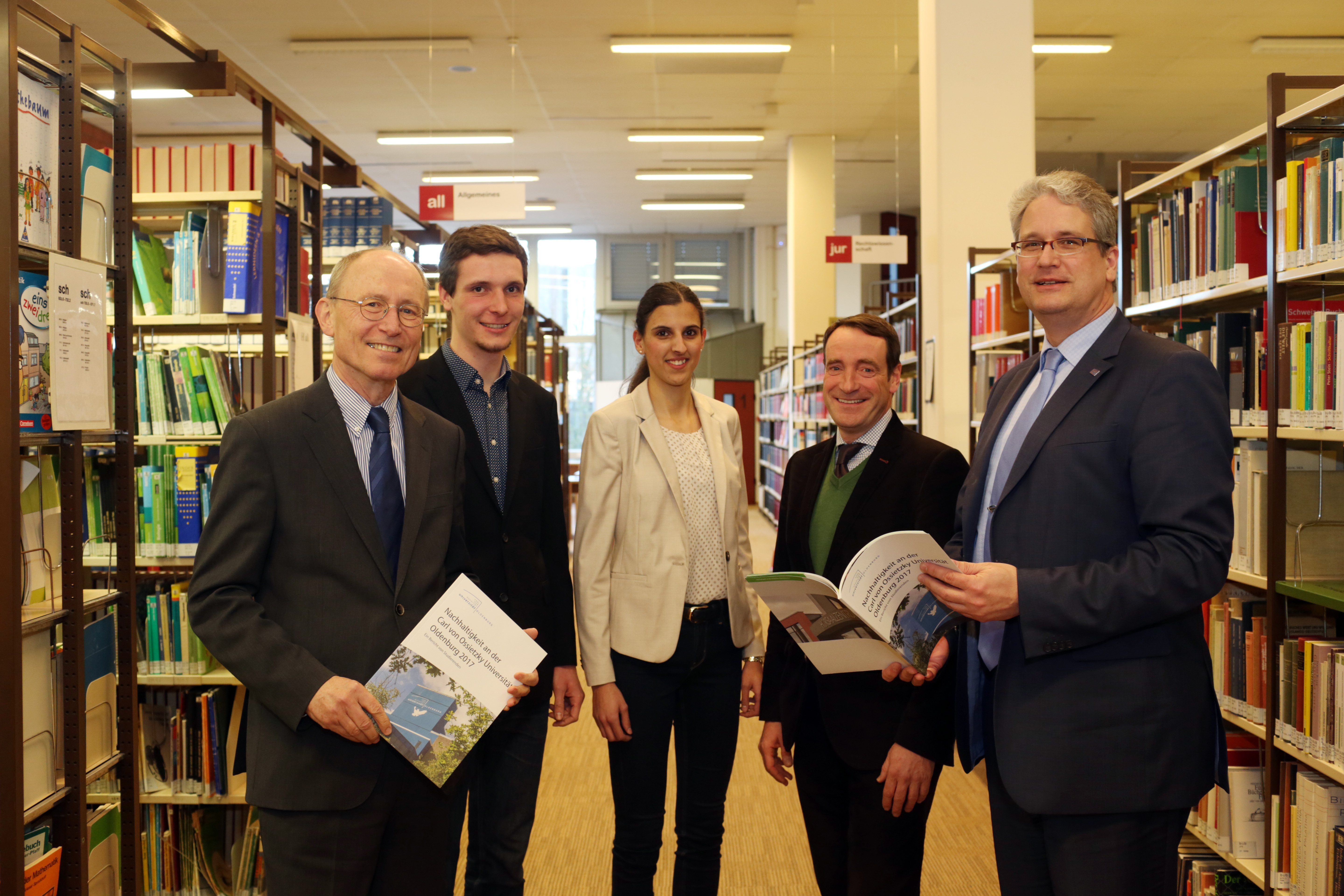 Universitätspräsident Prof. Dr. Dr. Hans Michael Piper (links), Jörg Stahlmann, Vizepräsident für Verwaltung und Finanzen (rechts) zusammen mit Prof. Dr. Bernd Siebenhüner (2. v. r.) und Vertretern der Studierenden, die den Bericht erstellten. Foto: Markus Hibbeler/Universität Oldenburg |