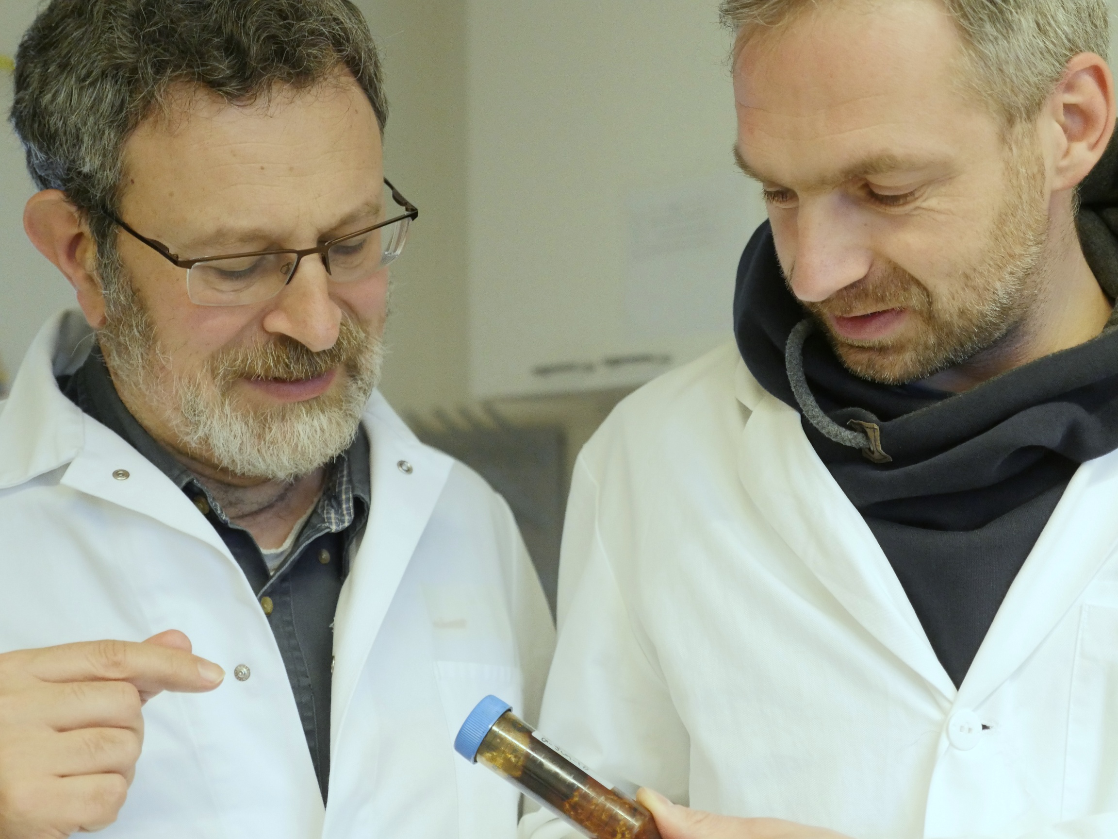 Prof. Dr. Andreas Teske (l.) und Dr. Helge-Ansgar Giebel mit einer Öl-Meerwasser-Probe des Deepwater-Horizon-Unfalls, aus der Tritonibacter isoliert wurde. Foto: Universität Oldenburg |