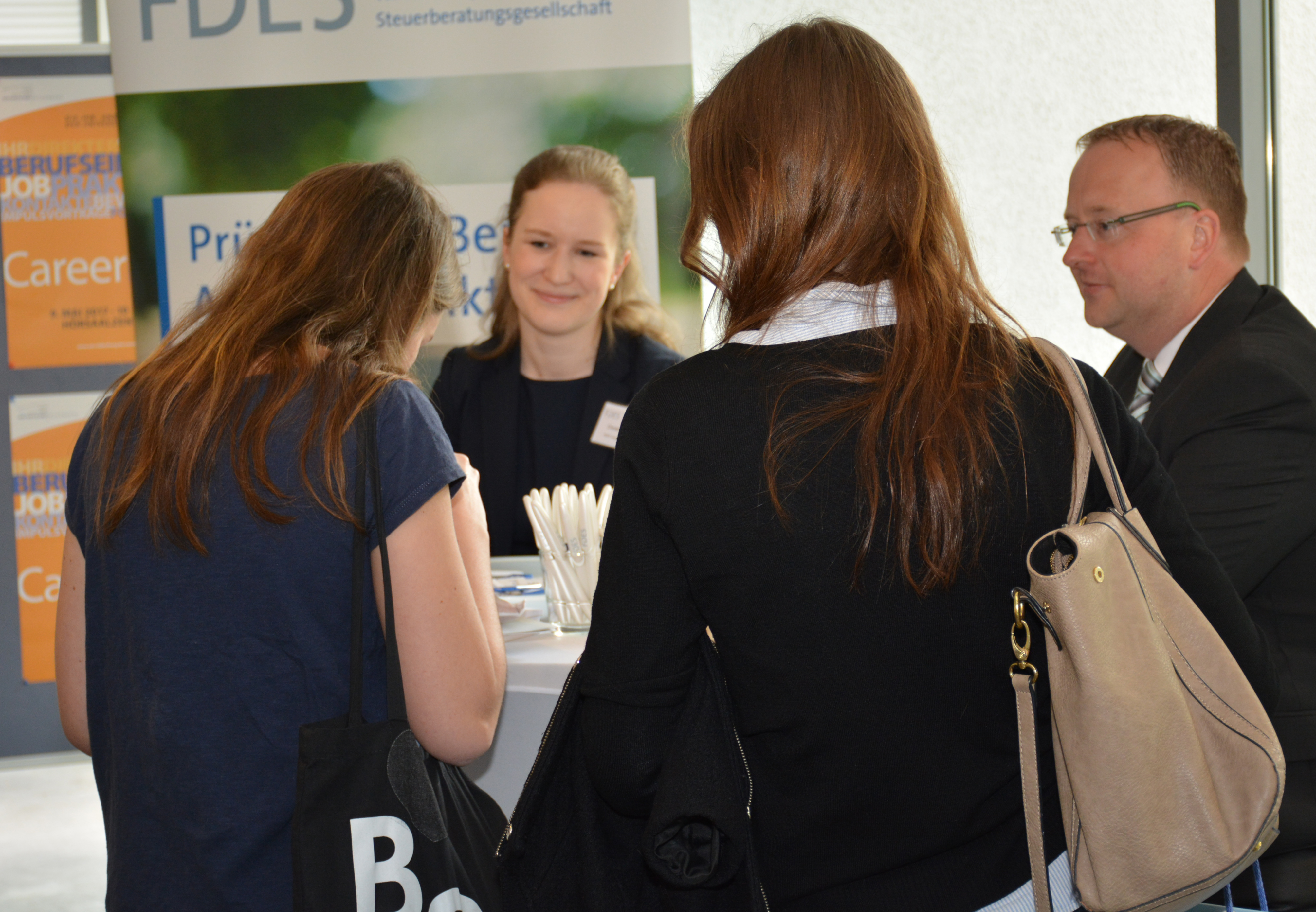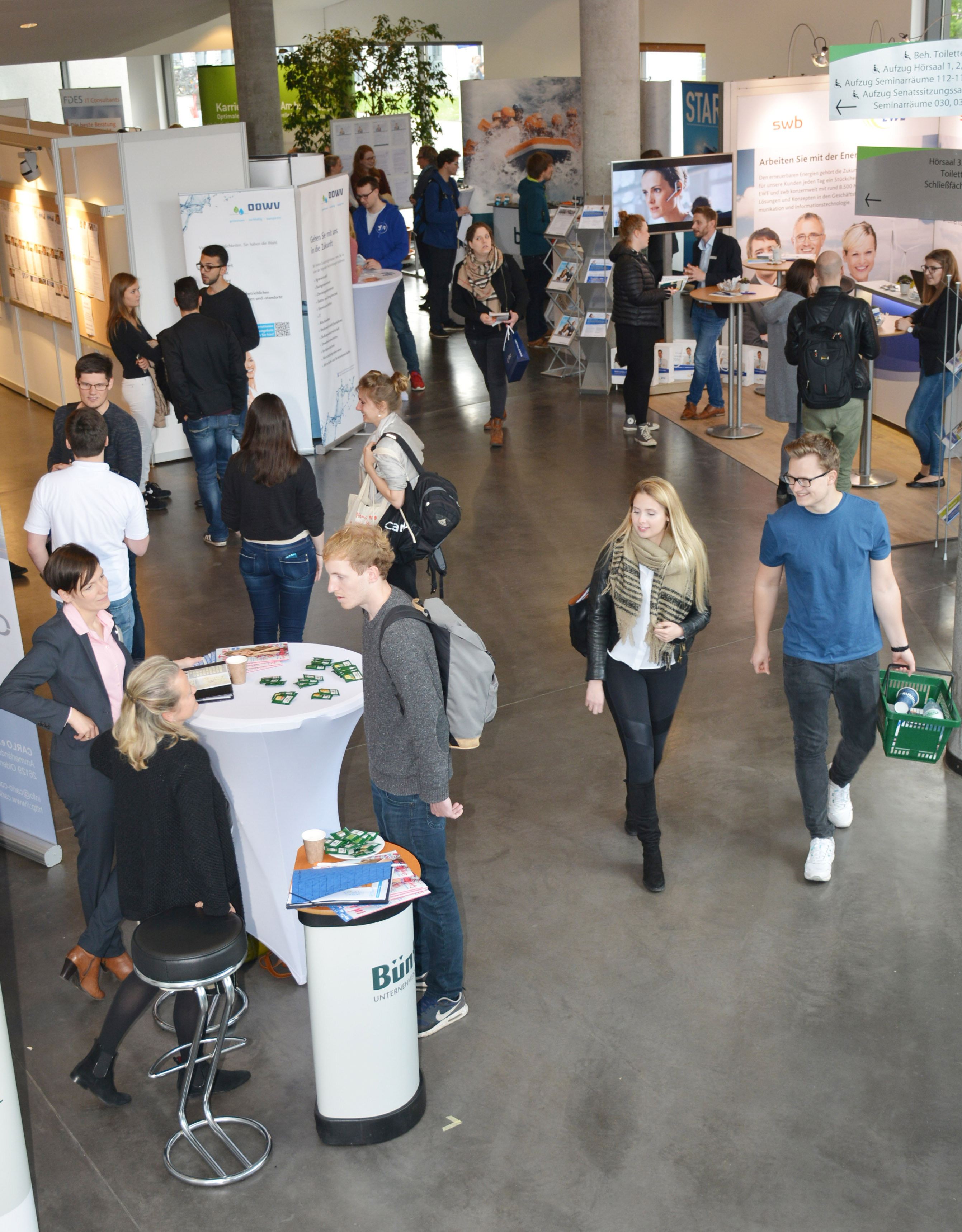 An den Messeständen im Foyer können sich Interessierte über die Unternehmen, ihre Struktur und mögliche Karrierechancen informieren und erste Kontakte mit Personalverantwortlichen knüpfen. Vertreten sind unter anderem Firmen aus den Branchen Energie- und Wasserversorgung, Handel, Banken und Versicherungen, IT- und Telekommunikation, Unternehmensberatung, Recht, Steuer- und Prüfungswesen sowie soziale Träger.