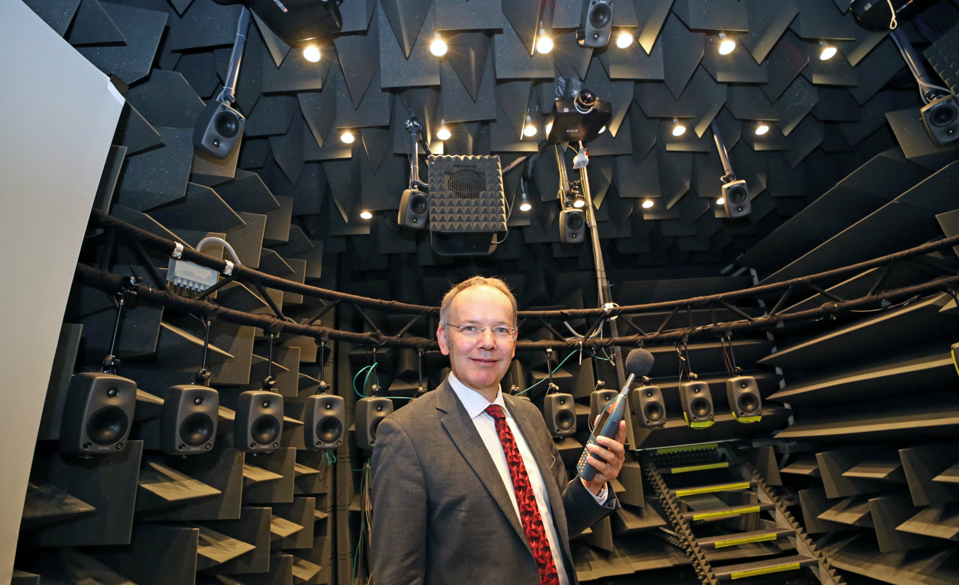 Komplexe Hörsituationen simulieren und gleichzeitig visualisieren: SFB-Leiter Volker Hohmann im „Virtual Reality Labor“. Foto: Markus Hibbeler/Universität Oldenburg |