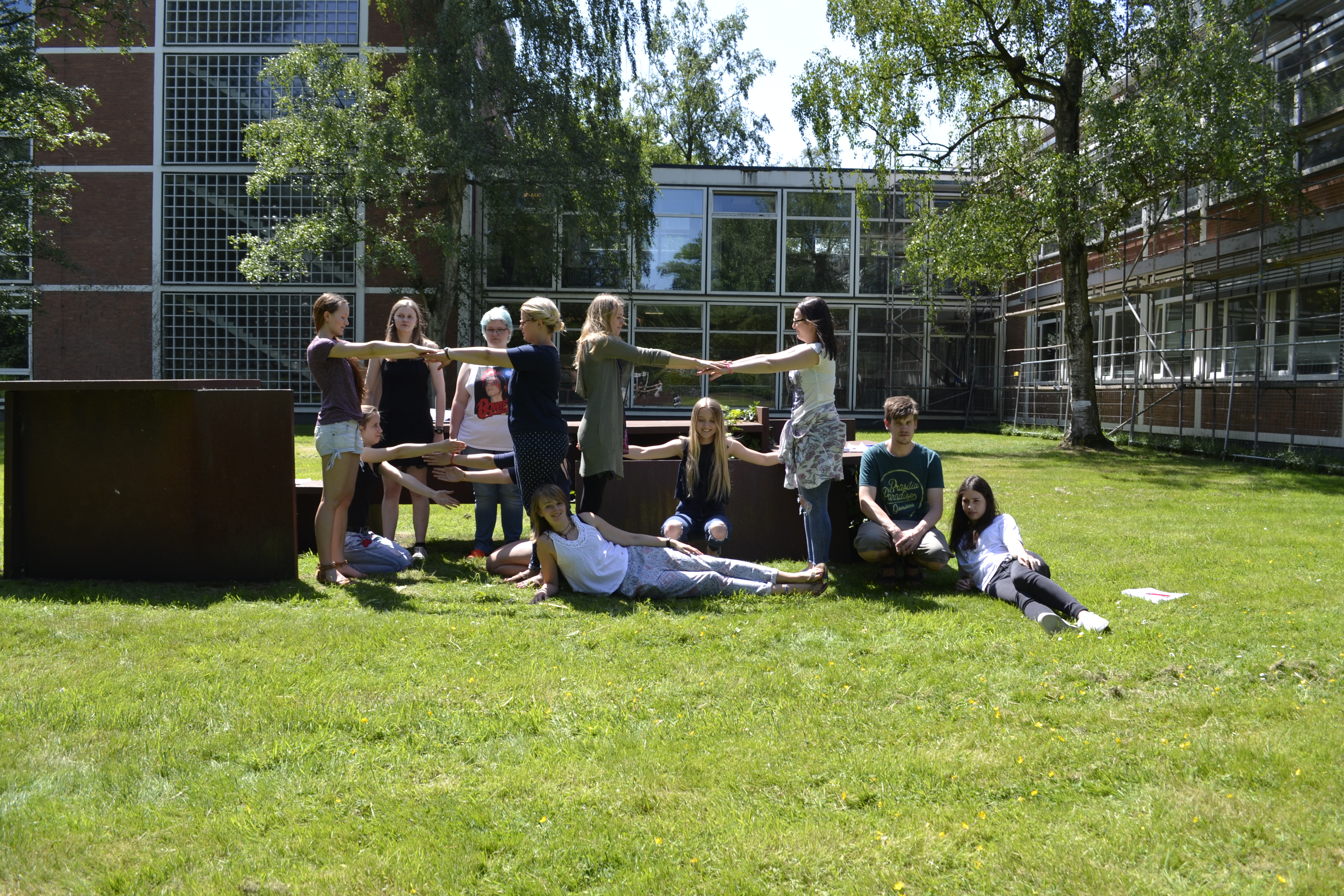 Unter dem Titel "Stahlplastik belebt" verkörpern Studierende der Veranstaltung „voll plastisch“ von Juliane Heise eine Kunst-am-Bau-Skulptur. Foto: Juliane Heise |