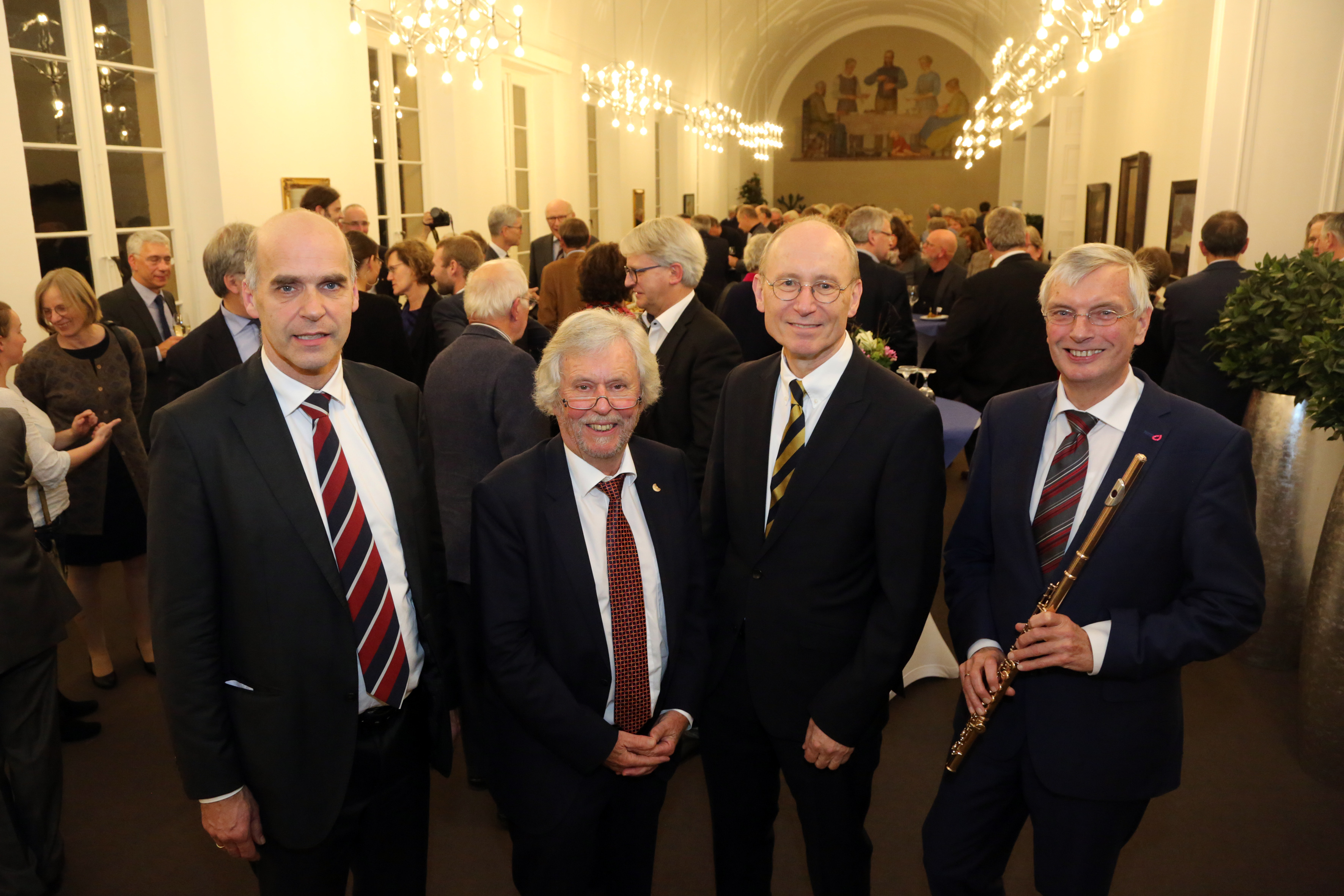 Verabschiedeten Prof. Dr. Reto Weiler (2. v. l.) in den Ruhestand: (v. l.) Prof. Dr. Hans Gerd Nothwang, Dekan der Fakultät VI Medizin und Gesundheitswissenschaften, Universitätspräsident Prof. Dr. Dr. Hans Michael Piper und Prof. Dr. Eckart Altenmüller von der Hochschule für Musik, Theater und Medien Hannover. Foto: Universität Oldenburg |