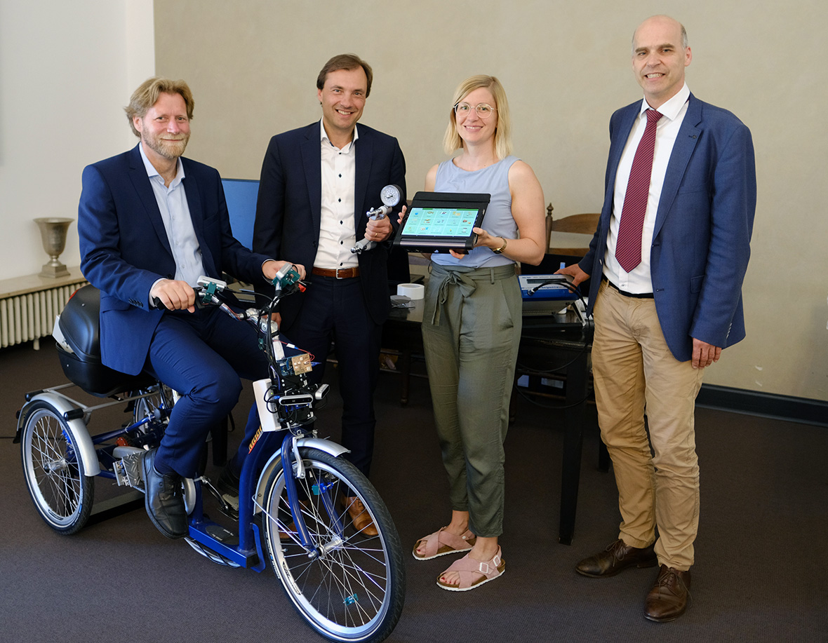 Technische Entwicklungen spielen in der Versorgungsforschung eine große Rolle. Departmentdirektor Prof. Dr. Andreas Hein auf einem Versuchsrad speziell für Kinder, um verkehrsgerechtes Verhalten zu fördern und unfallpräventiv zu wirken. Mit ihm auf dem Foto (v.l. ): Prof. Dr. Alexander Friedrich (Universität Groningen), Prof. Dr. Lena Ansmann, Leiterin der Abteilung Organisationsbezogene Versorgungsforschung, und der Dekan der Fakultät VI Medizin und Gesundheitswissenschaften Prof. Dr. Hans Gerd Nothwang. |