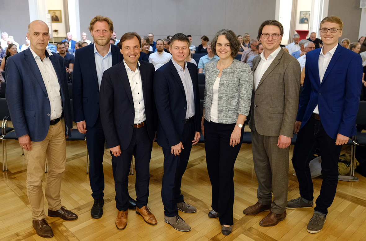Freude über fünf Jahre Versorgungsforschung (v.l.): Dekan Prof. Dr. Hans Gerd Nothwang, Departmentdirektor Prof. Dr. Andreas Hein, Prof. Dr. Alexander Friedrich (Universität Groningen), Prof. Dr. Falk Hoffmann, Prof. Dr. Tania Zieschang, Prof. Dr. Mark Schweda (alle Department für Versorgungsforschung) und Moderator Jens-Steffen Scherer |