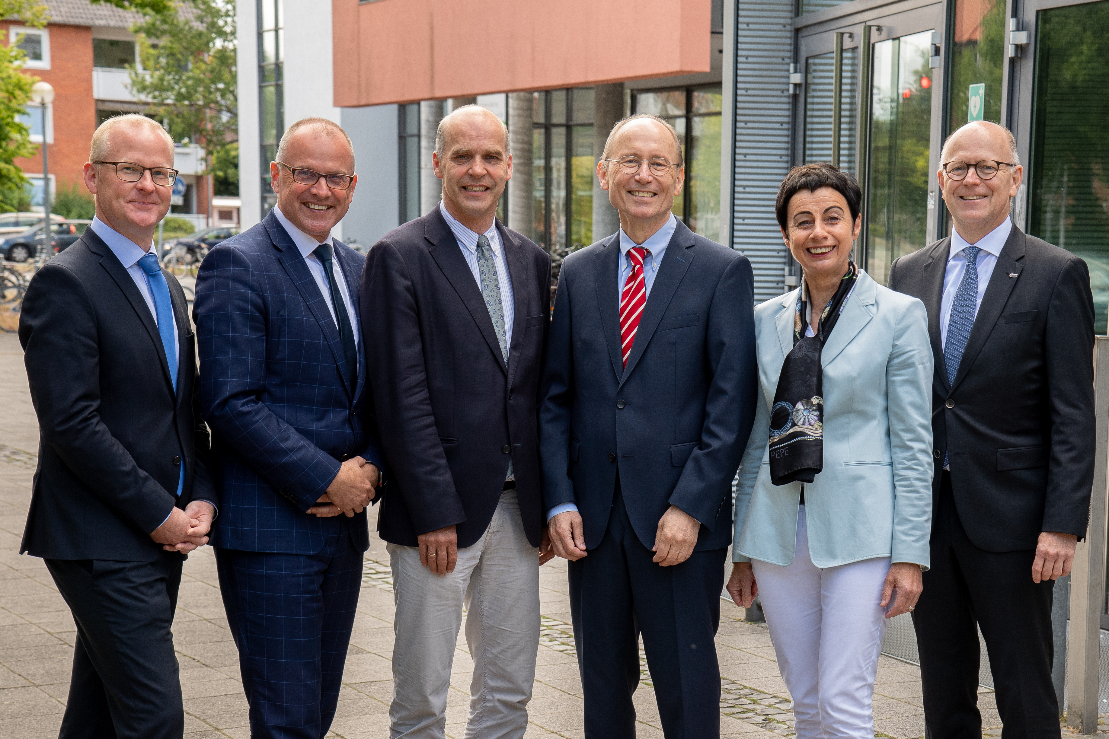 Begrüßen die Stellungnahme des Wissenschaftsrats: Prof. Dr. Dr. Hans Michael Piper (Präsident Universität Oldenburg, 4. v.l.) und Prof. Dr. Hans Gerd Nothwang (Dekan Fakultät VI Medizin und Gesundheitswissenschaften, 3. v.l.) sowie (v.l.) Michael Poerschke (Karl-Jaspers-Klinik), Dr. Alexander Poppinga (Evangelisches Krankenhaus Oldenburg), Elisabeth Sandbrink (Pius-Hospital Oldenburg) und Rainer Schoppik (Klinikum Oldenburg). Foto: Universität Oldenburg |