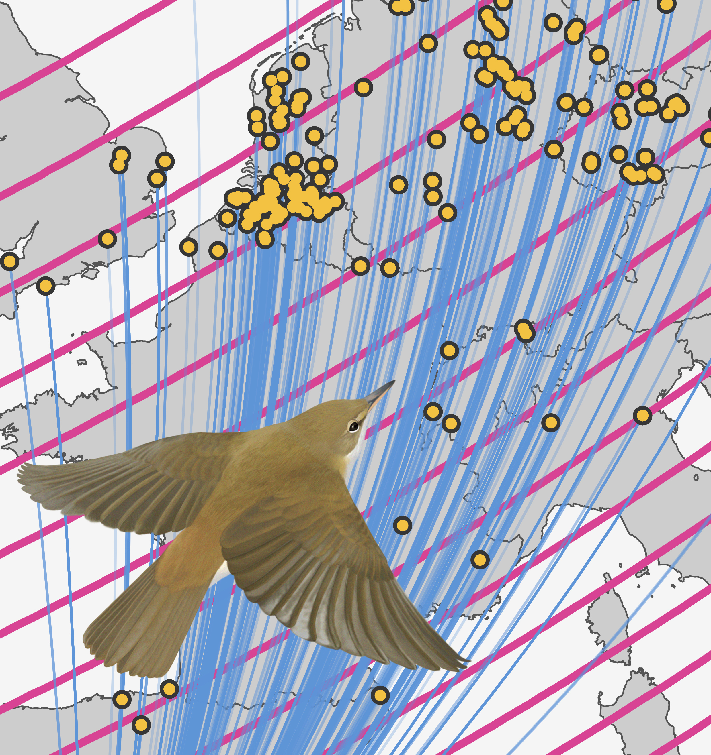 Das Team analysierte Beringungsdaten von fast 18.000 Teichrohrsängern, die aus der Zeit zwischen 1940 und 2018 stammen. Teichrohrsänger sind winzige Singvögel, die jedes Jahr die Sahara überqueren und den Sommer in Europa verbringen. Sie zählen zu den Arten, die seit fast hundert Jahren mit kleinen Metallfußringen individuell markiert werden. Sowohl die Beringungsorte als auch die Fundorte werden für ganz Europa zentral erfasst. „Diese Daten sind ein fantastisches Mittel, um Fragen zum Vogelzug zu beantworten, weil sie über so viele Jahre hinweg in einem sehr großen Gebiet gesammelt wurden“, sagt Wynn.