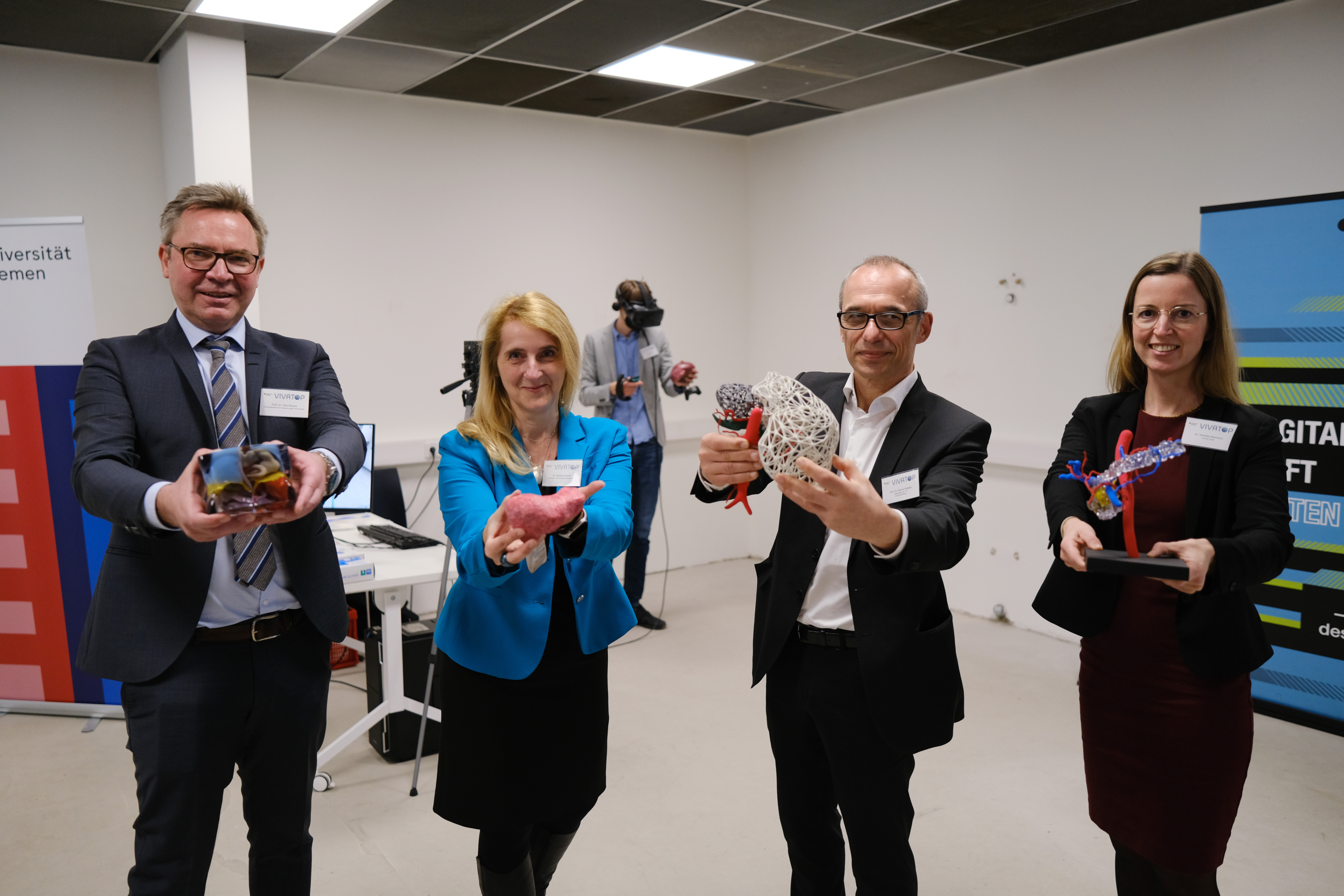 Virtuelle und reale 3D-Ansichten unter anderem von Organen standen im Projekt Vivatop im Mittelpunkt. Prof. Dr. Dirk Weyhe (l.), Professor der Universität Oldenburg und Viszeralchirurg am Pius-Hospital Oldenburg, hat die verschiedenen Technologien in seinem OP ausprobiert, die unter anderem von den Teams um Dr. Andrea Schenk (2.v.l.), Fraunhofer MEVIS Bremen, und Dr. Daniela Salzmann von der Firma apoqlar entwickelt wurden. Prof. Dr. Rainer Malaka (2.v.r.) ist Direktor des Technologie-Zentrums Informatik und Informationstechnik (TZI) der Universität Bremen, das das Vivatop-Projekt koordiniert hat. Foto: Markus Hibbeler / Universität Oldenburg |