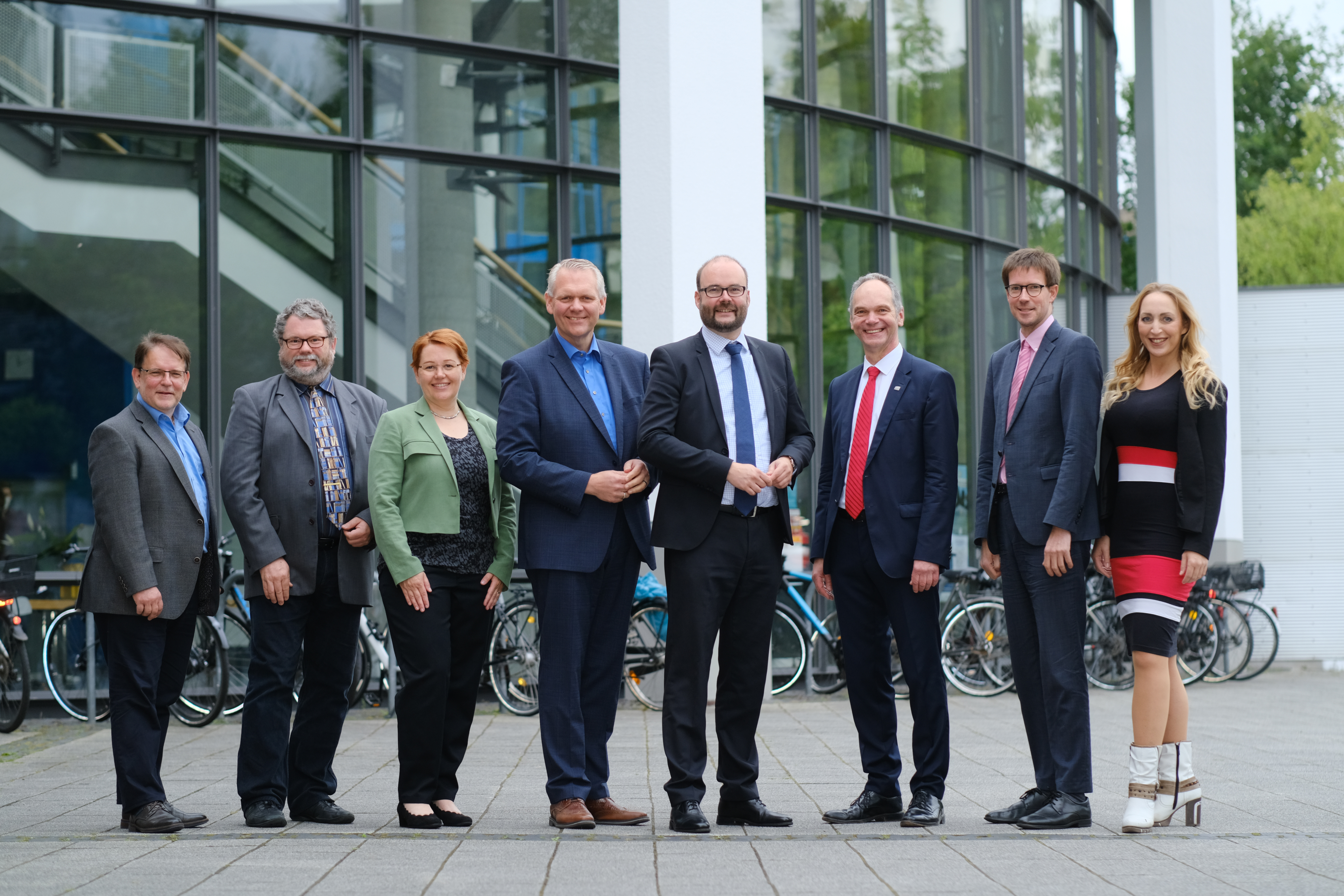 Im Austausch über digitale Bildung an der Universität Oldenburg (v.l.): Physikdidaktiker Prof. Dr. Michael Komorek, Lars Hoffmeier vom Didaktischen Zentrum (DiZ), Informatikdidaktikerin Prof. Dr. Ira Diethelm, Niedersachsens Wissenschaftsminister Björn Thümler, der sächsische Kultusminister Christian Piwarz, Universitätspräsident Prof. Dr. Ralph Bruder, der Vizepräsident für Studium, Lehre und Internationales, Prof. Dr. Karsten Speck, sowie DiZ-Geschäftsführerin Dr. Julia Michaelis. Foto: Universität Oldenburg |