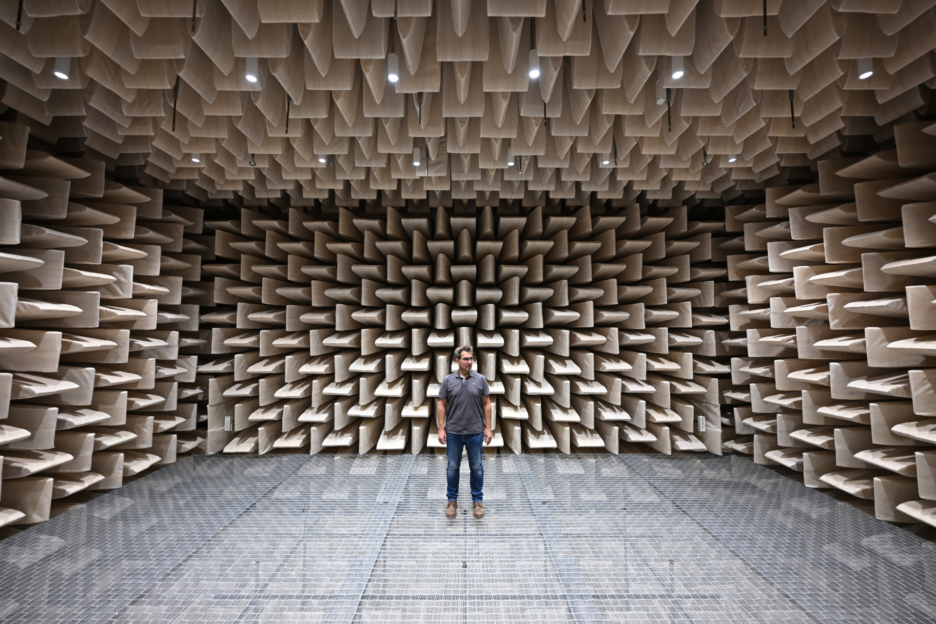 Ein Blick in das renovierte Akustiklabor. Um die Größenverhältnisse zu illustrieren, hat sich Techniker Christoph Scheicht zur Verfügung gestellt. Foto: Universität Oldenburg/Mohssen Assanimoghaddam |