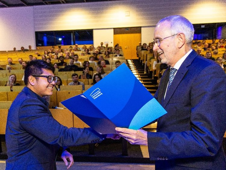 Dr. Daniel Kristanto (left) received the Hermine Heusler-Edenhuizen Prize, presented by Prof. Dr. Dr. Klaus Peter Kohse (right) on behalf of the Verein Freunde und Förderer der Universitätsmedizin Nordwest.