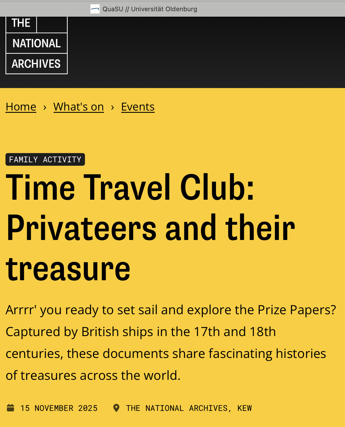 mehr: Rückblick auf Family Activity im Time Travel Club des TNA (The National Archives, London)Safe the Date: 15.11.25 Family Workshop at The National Archives (London, Kew) Time Travel Club: Privateers and their treasure