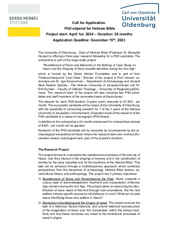 - „Josua 11, Richter 4 und Hazor: Literarische Befunde und archäologische Evidenzen” (Lennart F. Frost, University of Oldenburg; supervisor: Benedikt Hensel)