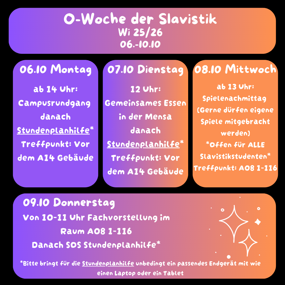 auch die Fachschaft bietet einige Veranstaltungen im Rahmen der O-Woche für alle neuen Studierenden der Slavistik an: