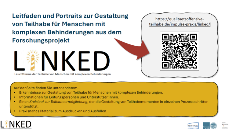 Am 30.09.2025 fand die digitale Abschlussveranstaltung zum vom BMAS geförderten Forschungsprojekt „Leuchttürme der Teilhabe von Menschen mit komplexen Behinderungen (LINKED)“ statt, das von Prof. Dr. Teresa Sansour und Dr. Caren Keeley (Universität zu Köln) geleitet wurde. Die für die Praxis aufbereiteten Ergebnisse sind nun auf der Online-Plattform "Qualitätsoffensive Teilhabe" (https://qualitaetsoffensive-teilhabe.de/impulse-praxis/linked/) sichtbar.