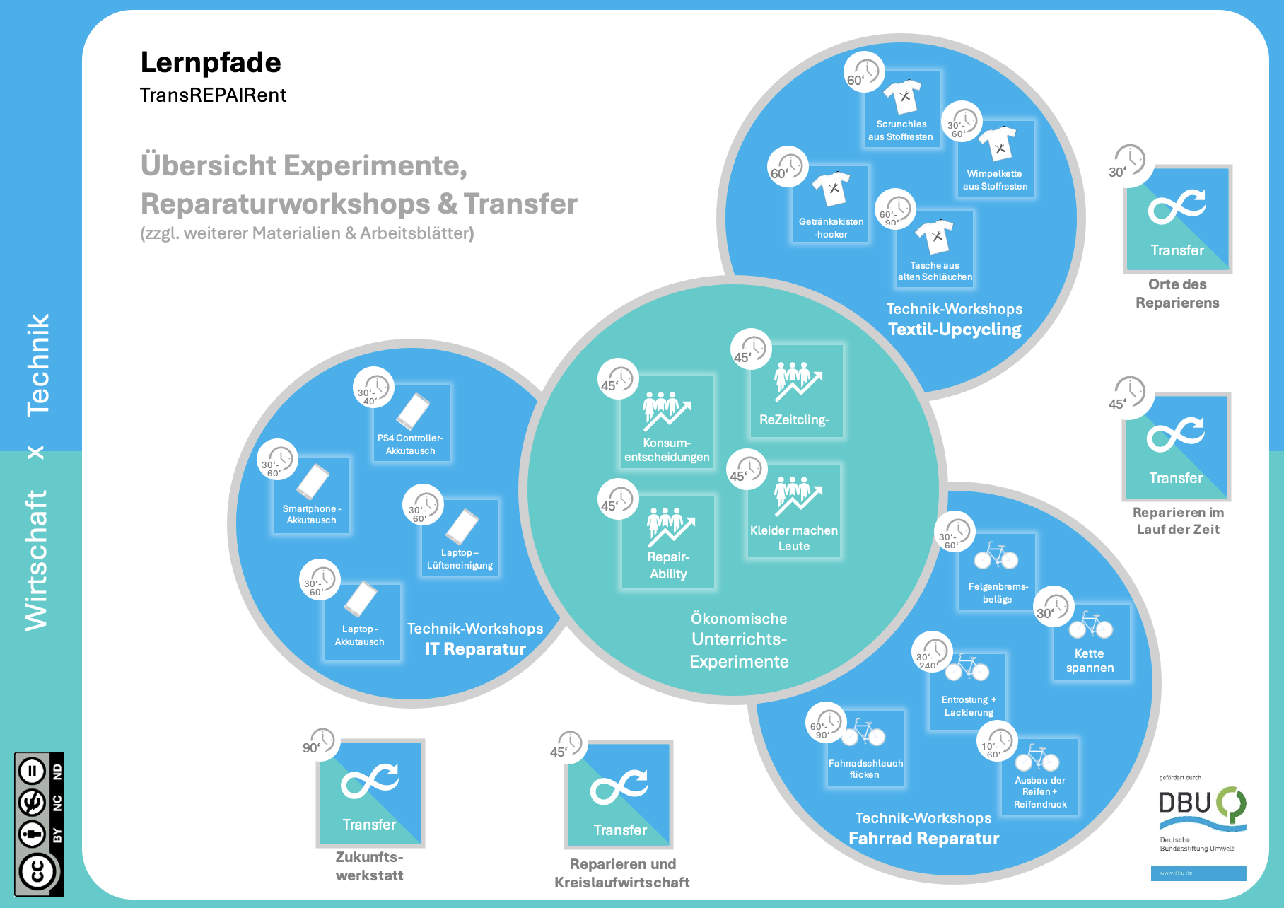 Die Sammlung ‚Kreislaufwirtschaft und Reparatur‘ umfasst in vier Modulen und drei Themenbereichen (IT-Reparatur, Fahrradreparatur, Textil-Upcycling) über 100 Einzelmaterialien für Lehrende und Lernende. Dabei liegt ein Fokus auf der Verknüpfung von Perspektiven der technischen und der ökonomischen Bildung. Handlungsorientierte Zugänge der technischen Bildung werden mit Unterrichtsexperimenten der ökonomischen Bildung verknüpft, um ganzheitliche Zugänge zu Dilemmata des Reparierens zu ermöglichen. Der transdisziplinäre Ansatz ist unter Beteiligung von Praxispartnern und außerschulischen Lernorten (u.a. Schülerlaboren) entstanden und richtet sich an Lernende der Sekundarstufe 1. Das erstellte Material ist in vier thematischen Modulen organisiert: Einflüsse auf Reparaturentscheidungen, Dilemma des Reparierens, sozialer Druck sowie Reparierbarkeit & Obsoleszenz. Jedes Modul enthält einen Beispiellernpfad, der Reparaturanleitungen, Unterrichtsexperimente, Erklärvideos und Arbeitsblätter verbindet. Die modularen Materialien können auch unabhängig von den Lernpfaden verwendet und kombiniert werden, um die Angebote für möglichst vielseitige Bedürfnisse und Interessen flexibel nutzbar zu machen. Insgesamt werden dreizehn Reparaturanleitung angeboten, die mit vier Experimenten kombiniert werden können: Konsumentscheidungen, Re-Zeit-Cling, Kleider machen Leute und Repair-Ability. Die Materialien wurden im Rahmen des Projekts TransREPAIRent entwickelt, welches durch eine Förderung der Deutschen Bundesstiftung Umwelt ermöglicht wurde.