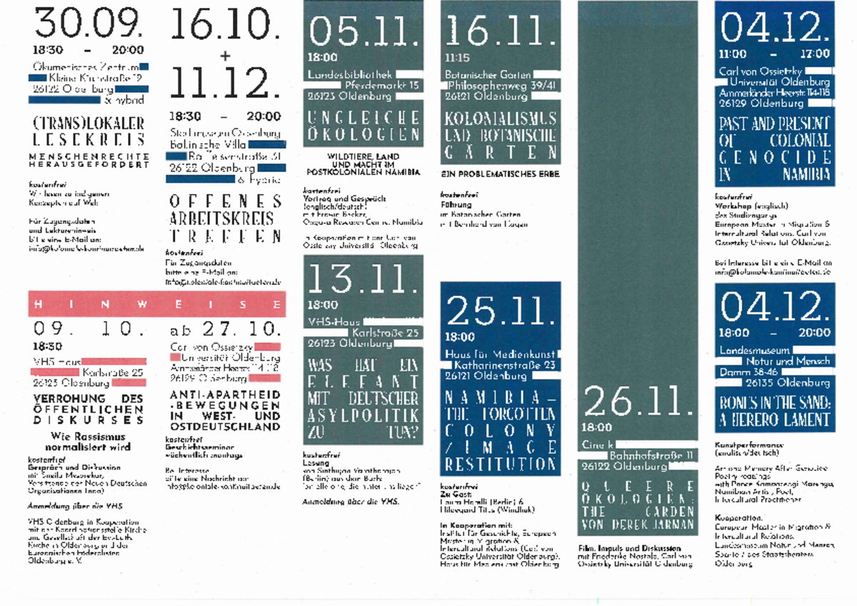 Im Rahmen einer Kooperation zwischen mit dem Bündnis Koloniale Kontinuitäten und dem Institut für Evangelische Theologie und Religionspädagogik der Carl-von-Ossietzkyuniversität in Oldenburg finden von April bis Juni im CineK (Bahnhofstraße) von 18:00-20:00 Uhr drei Vortrags-/Gesprächsveranstaltungen statt. Es werden Gäst:innen erwartet, die anhand eines eigenen Forschungsschwerpunkt postkoloniale Perspektiven konkretisieren und im Anschluss mit uns ins Gespräch kommen wollen.