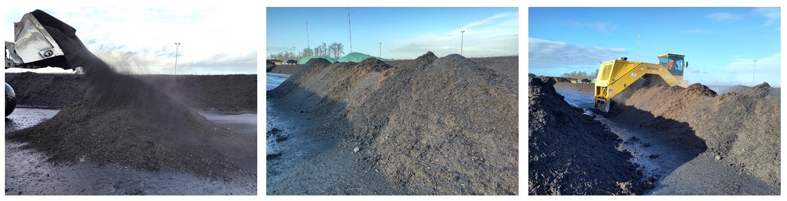 Bilder: Grasartiges Landschaftspflegematerial (links) wird in Hydrokohle (Mitte) umgewandelt. Das Hydrokohle-Kompost-Substrat im Pflanzversuch mit Ringelblumen (rechts). M. Röhrdanz