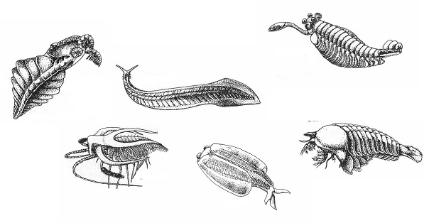 Im Kambrium existierte ein reiche Fauna aus „Typen“, die heute nicht zu finden sind, darunter auch unser Vorfahr und der aller Wirbeltiere: Pikaia (Bildmitte).