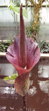 mit einer Größe von 160 Zentimetern war kürzlich im Tropengewächshaus des Botanischen Gartens zu bewundern: Amorphophallus konjac, die kleine Schwester der Titanenwurz, zeigte sich in voller Pracht. Die Pflanze, deren einzige Blüte einen üblen Geruch verbreitet, gehört wie unser einheimischer Aronstab zur Familie der Araceaen. Ursprünglich kommt sie aus China und Vietnam. Die Knolle wird in Japan und Indonesien als Nahrungsmittel geschätzt. Sie gilt auch als besonderes Nahrungsmittel für Diabetiker, da die Knolle anstatt Zucker Glucomannane enthält. |