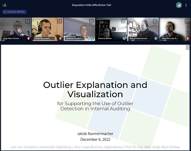 Am 6. Dezember 2022 hat Jakob Nonnenmacher seine Dissertation mit dem Titel „Outlier Explanation and Visualization for Supporting the Use of Outlier Detection in Internal Auditing" erfolgreich verteidigt. Die Abteilung Wirtschaftsinformatik VLBA gratuliert herzlich dazu.