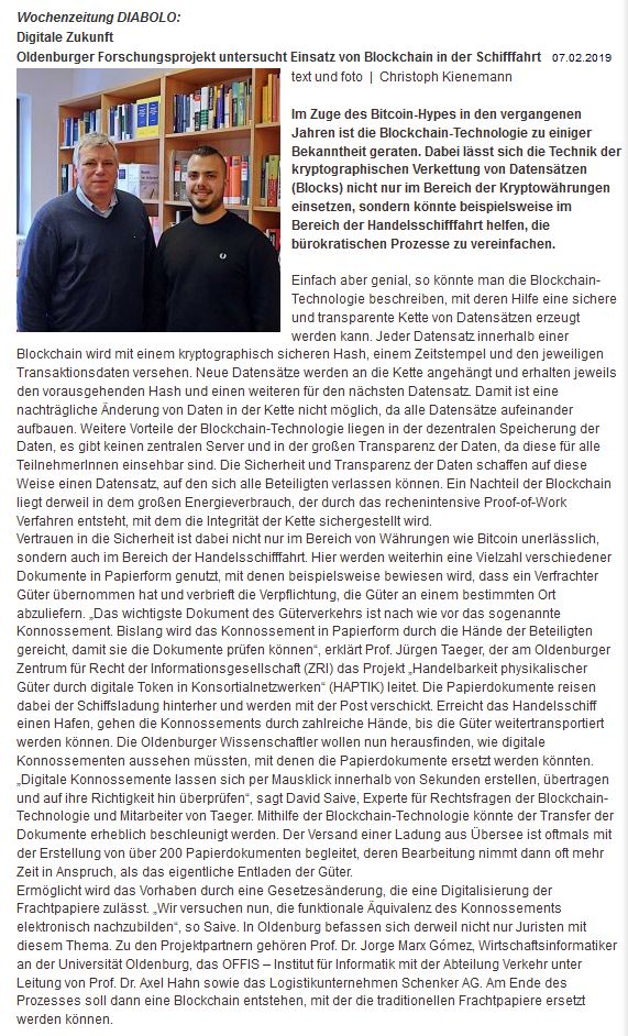 Saive, David/Taeger, Jürgen im Gespräch mit Christoph Kienemann: Oldenburger Forschungsprojekt untersucht Einsatz von Blockchain in der Schifffahrt, DIABOLO, 7.2.2019 (Link).